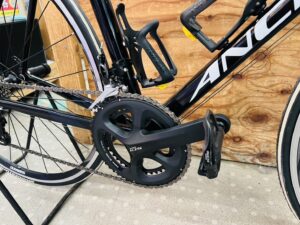 ANCHORが考える性能理論をアルミモデルに使ったレーシングモデルで、ジオメトリーはヘッドチューブ短めになっていて上体は前傾になり踏むパワーを出しやすく空気抵抗も軽減するスタイルです。