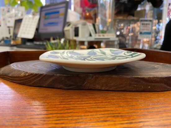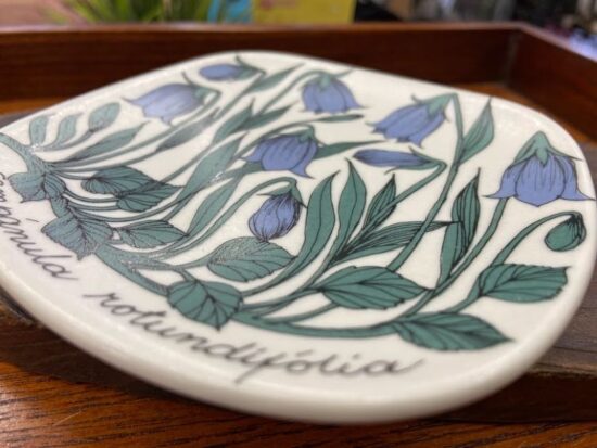 バイオレットブルーの鐘型のお花がプレートいっぱいに描かれ白地の肌が彩色を鮮やかに縁取っています