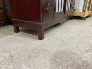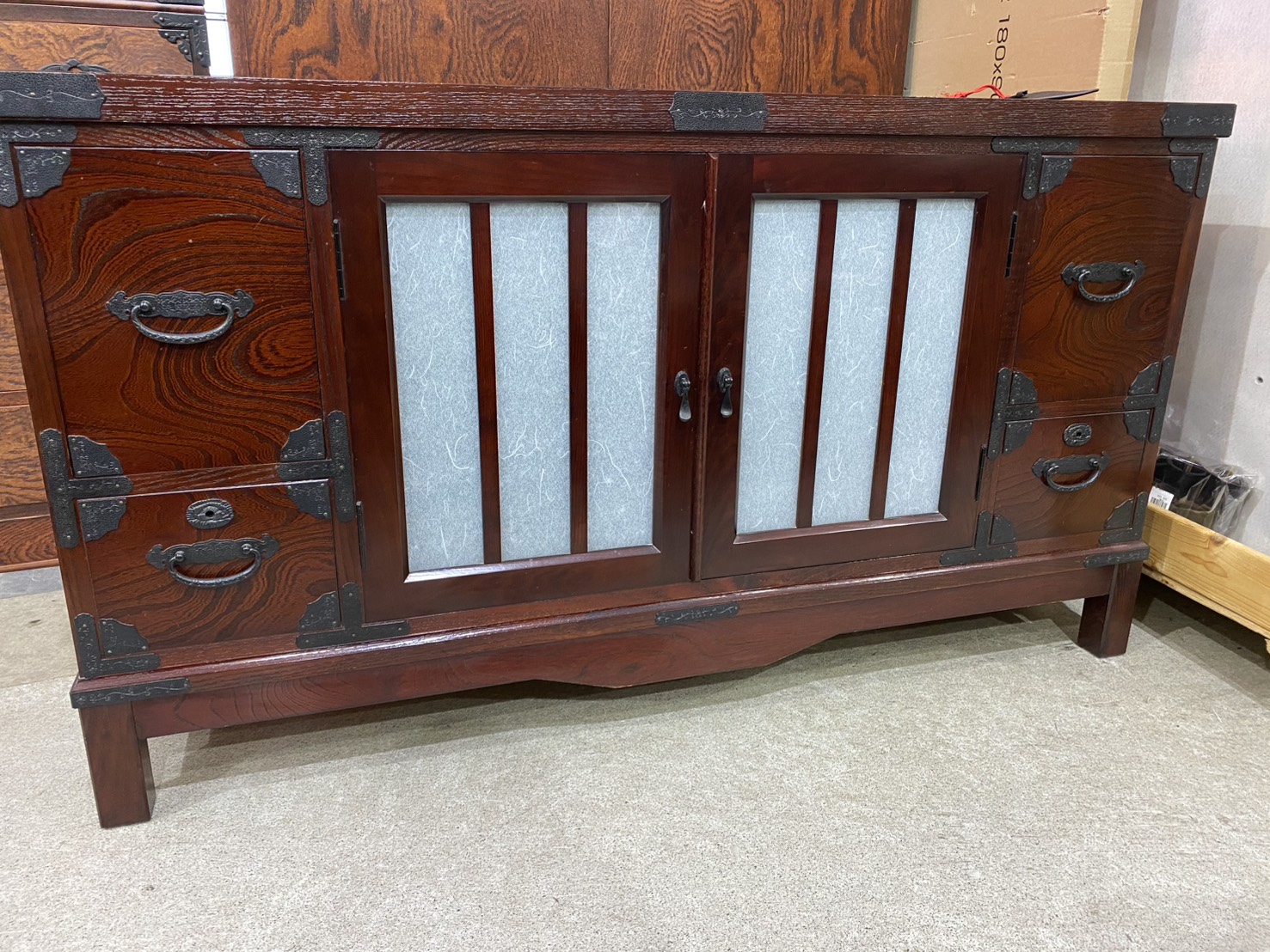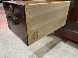 塗装は時代塗りで、金具類はサビが出にくいように焼付塗装、引出し側面には焼印入りで、背面化粧仕上げなのでお部屋の仕切りとしてもお使い頂けます。