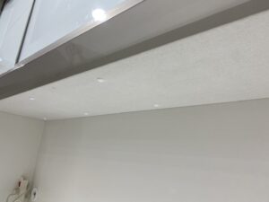 家事のしやすいハイカウンターは大型レンジの設置ができる広々とした奥行きとなっており、湿気を吸収・放出し、防火性能に優れた素材「MOISS(モイス)」機能付きです。