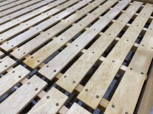 ベッドフレームはタモ材でシンプル、スノコの床板で通気性に優れています。