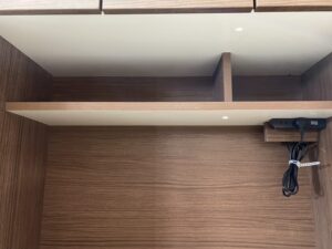 棚板も豊富でネジ式なので耐久力もあり、天板にはコンセント2口装備しています。