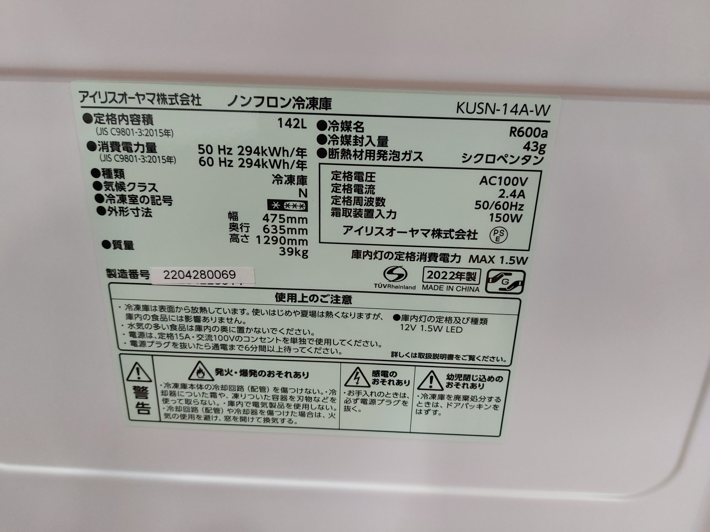庫内容量:冷凍室/142L