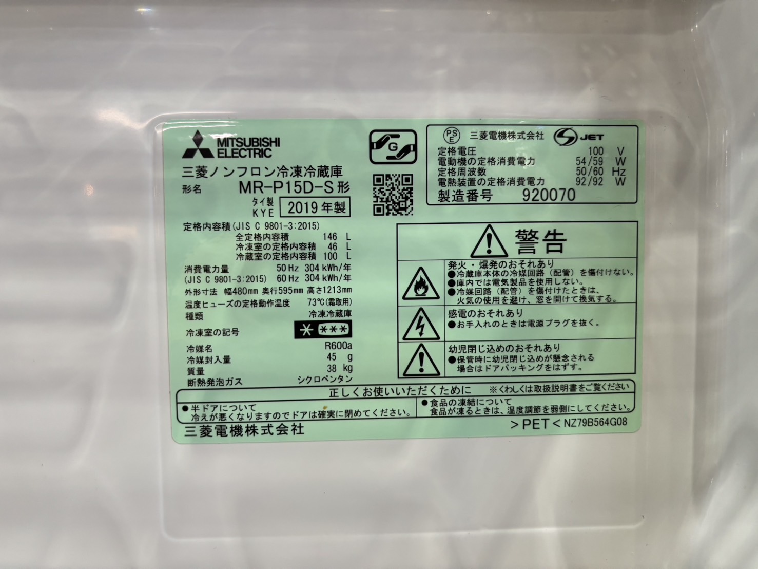 庫内容量:冷蔵室/100L・冷凍室/46L
