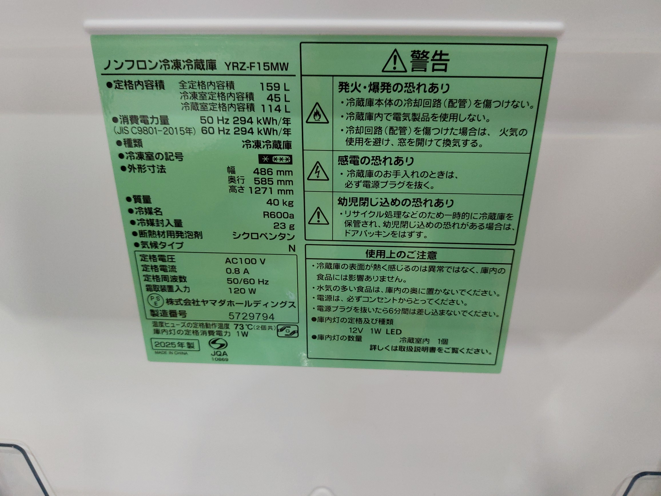 庫内容量:冷蔵室/114L・冷凍室/45L