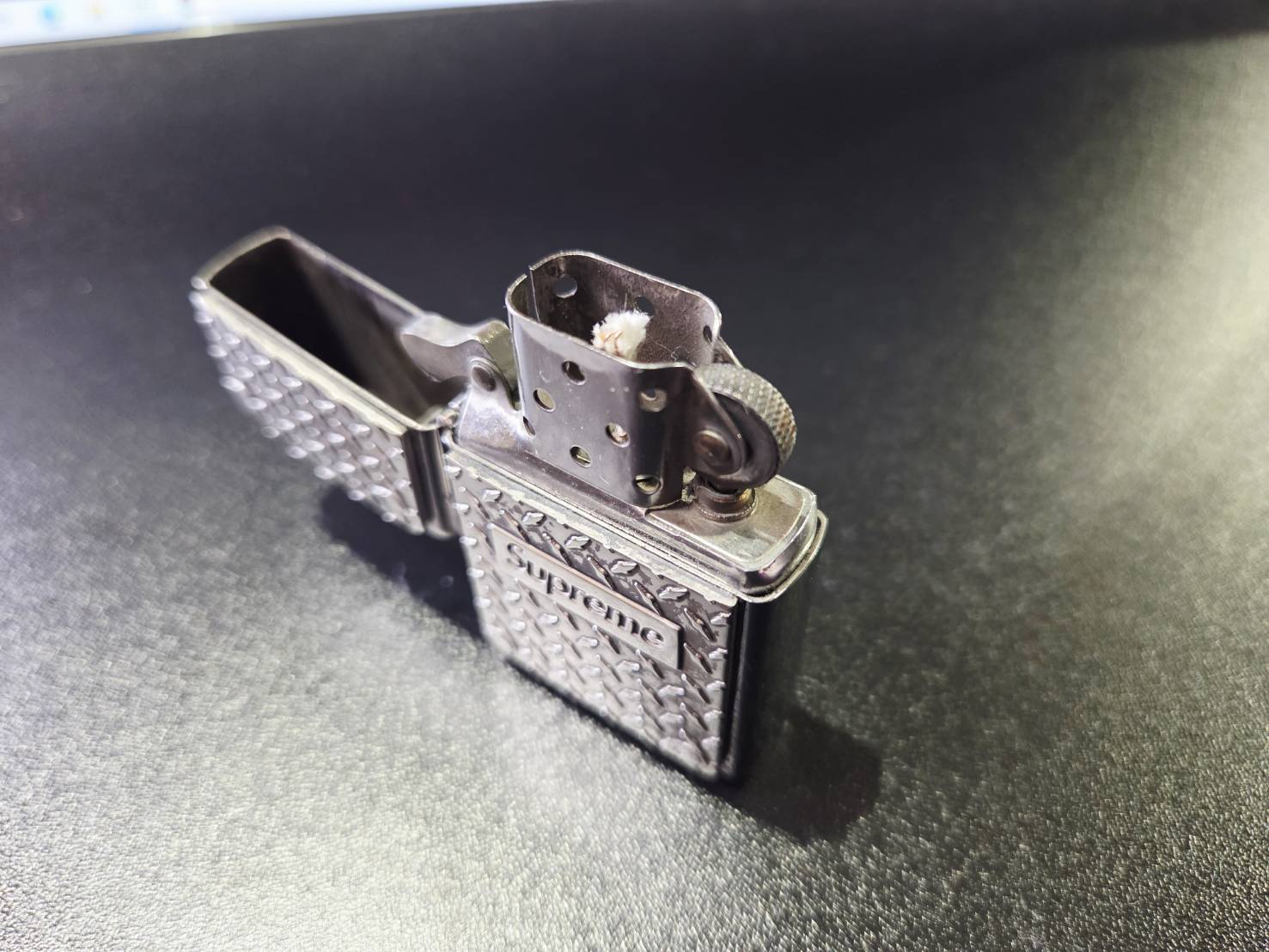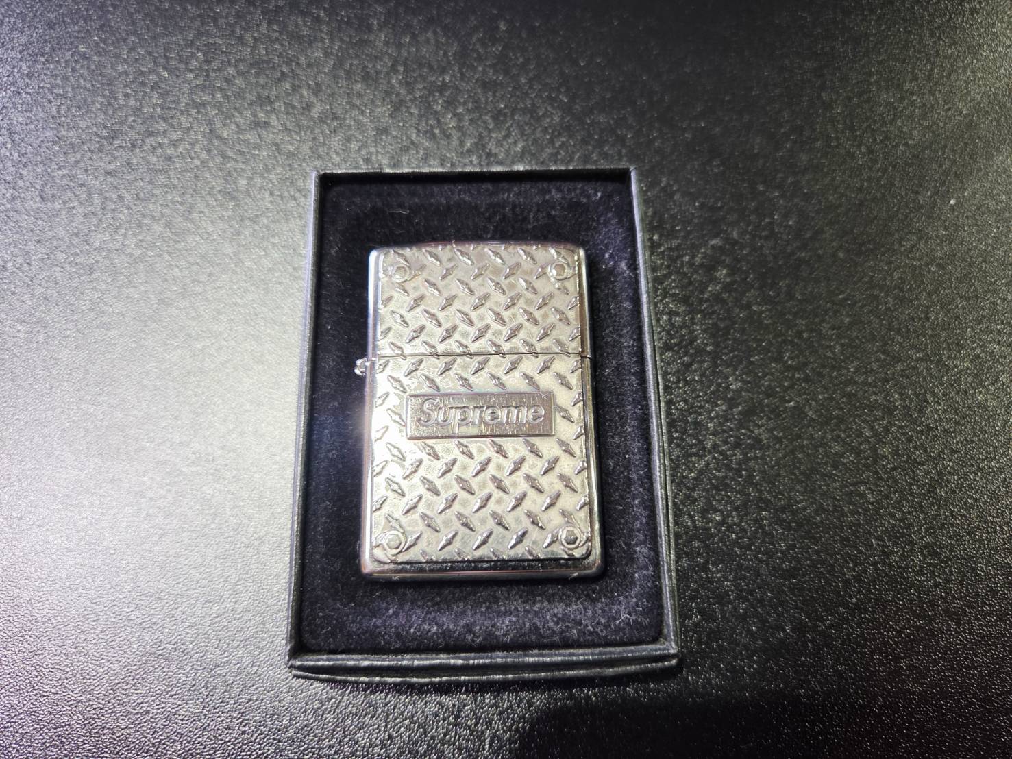 ダイヤモンドプレート柄が全体にエンボス加工されており、タフな印象を与えます。ライターの前面には、Supremeのロゴが刻印されています。