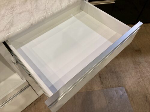 大理石調の天板と明るい光沢のあるホワイトカラーで清潔感のあるキッチン周りになります。