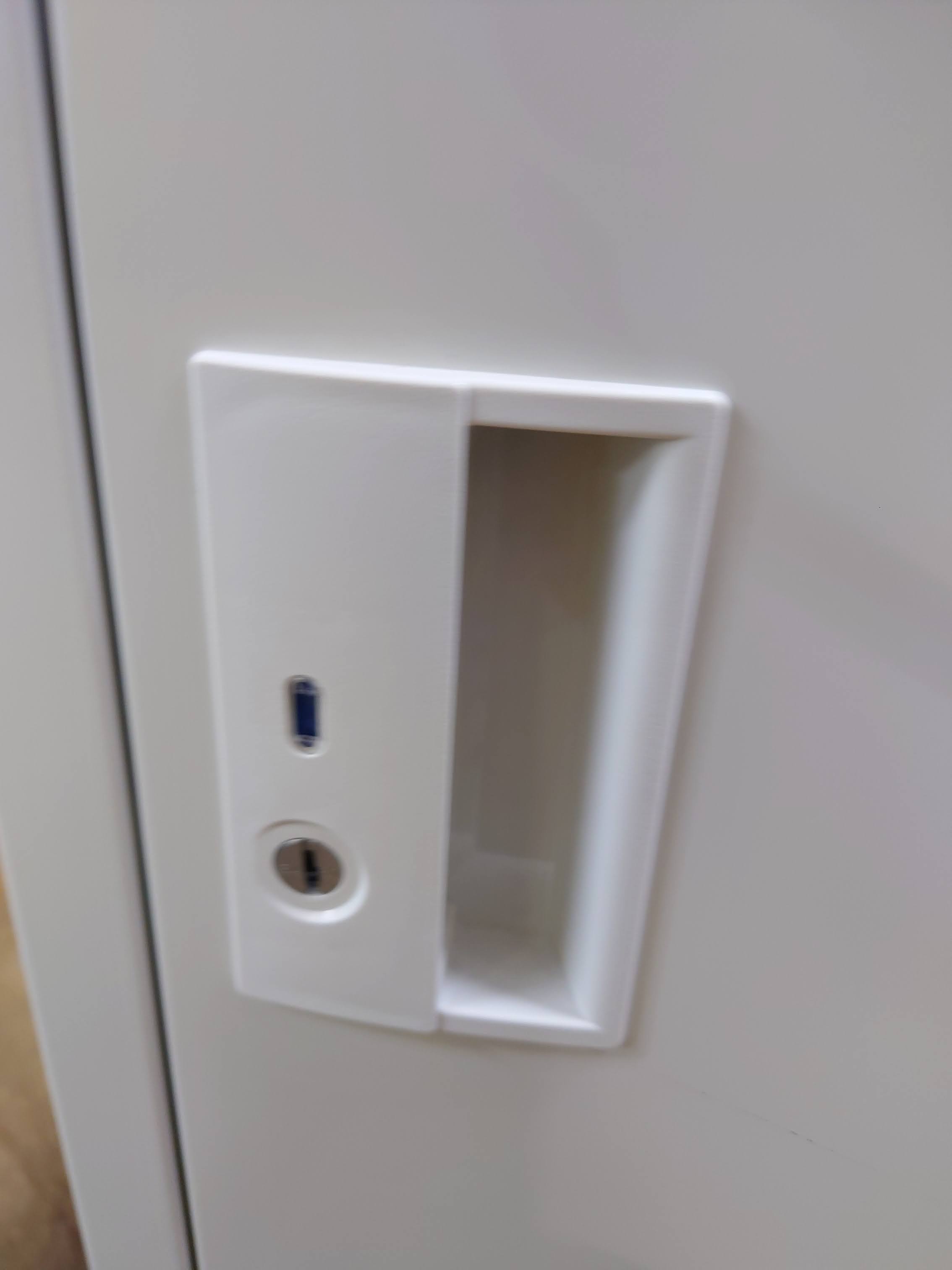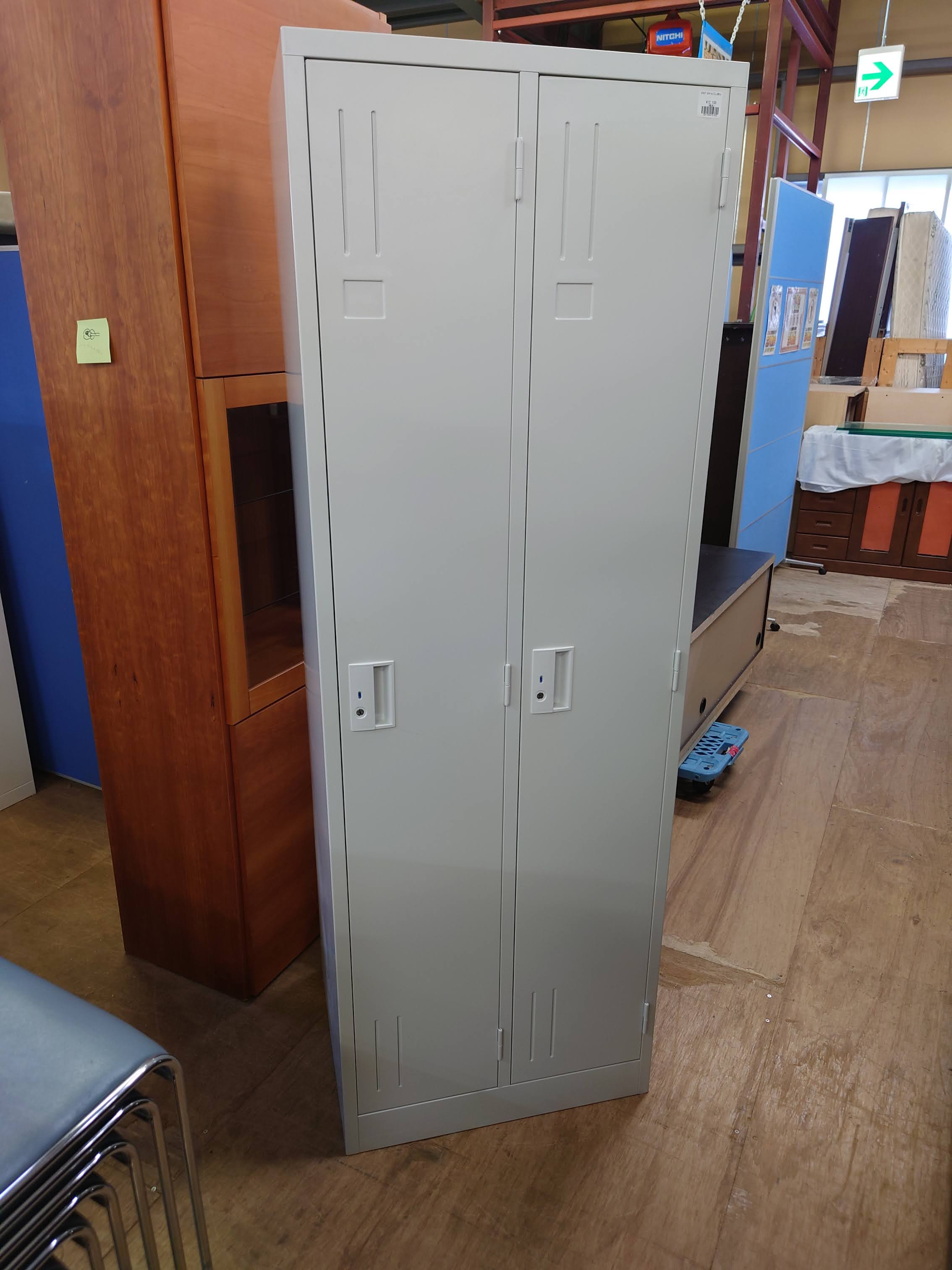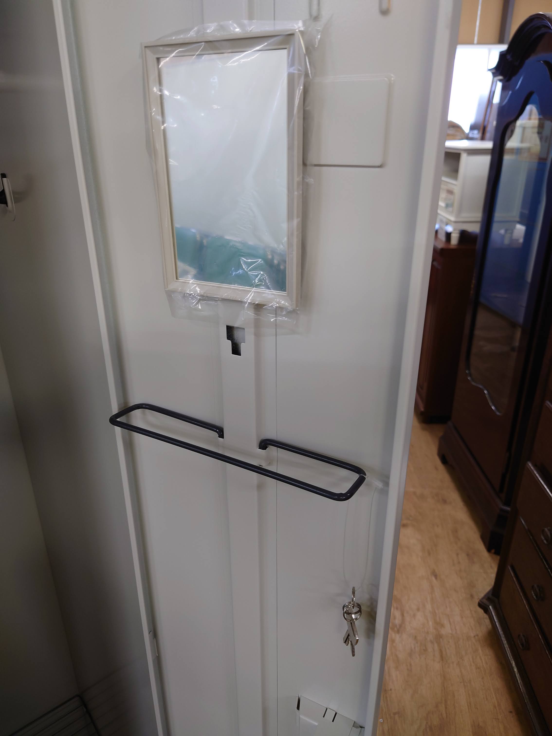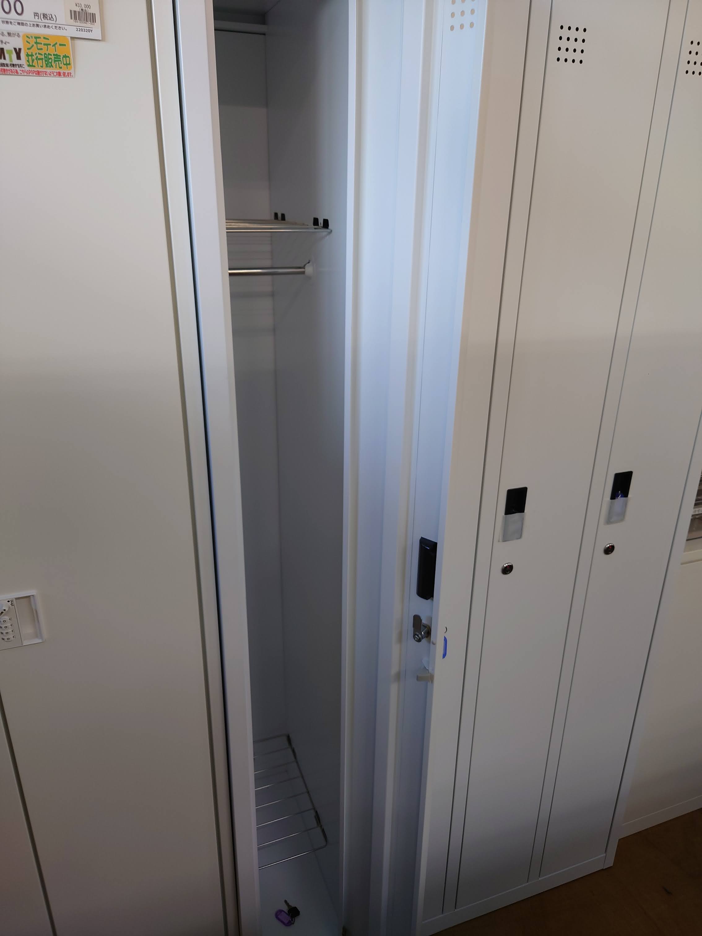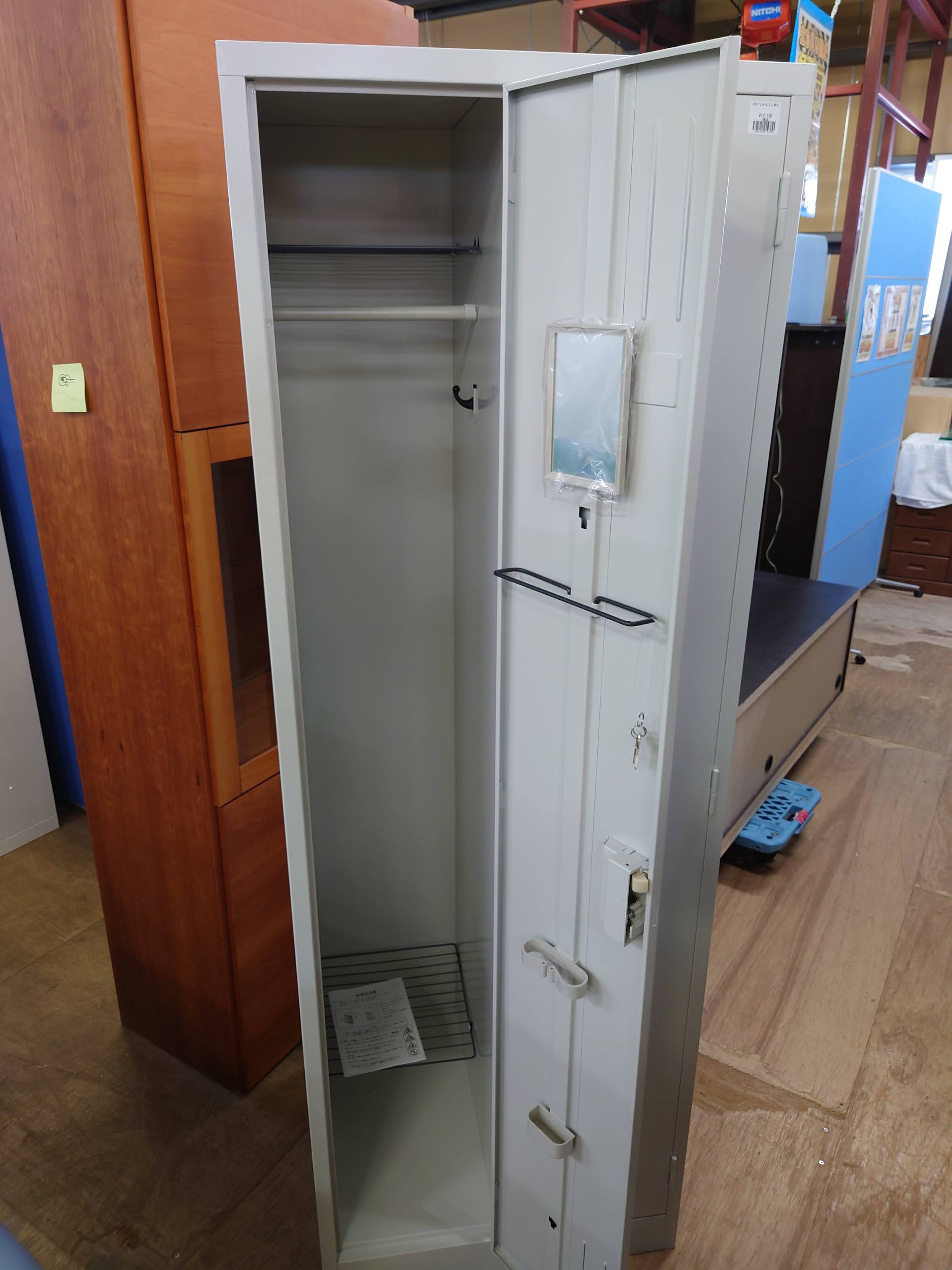 ロングコートなども入る縦型のロッカーになります。鏡・ポール・棚板など収納するのに一通りそろっております。