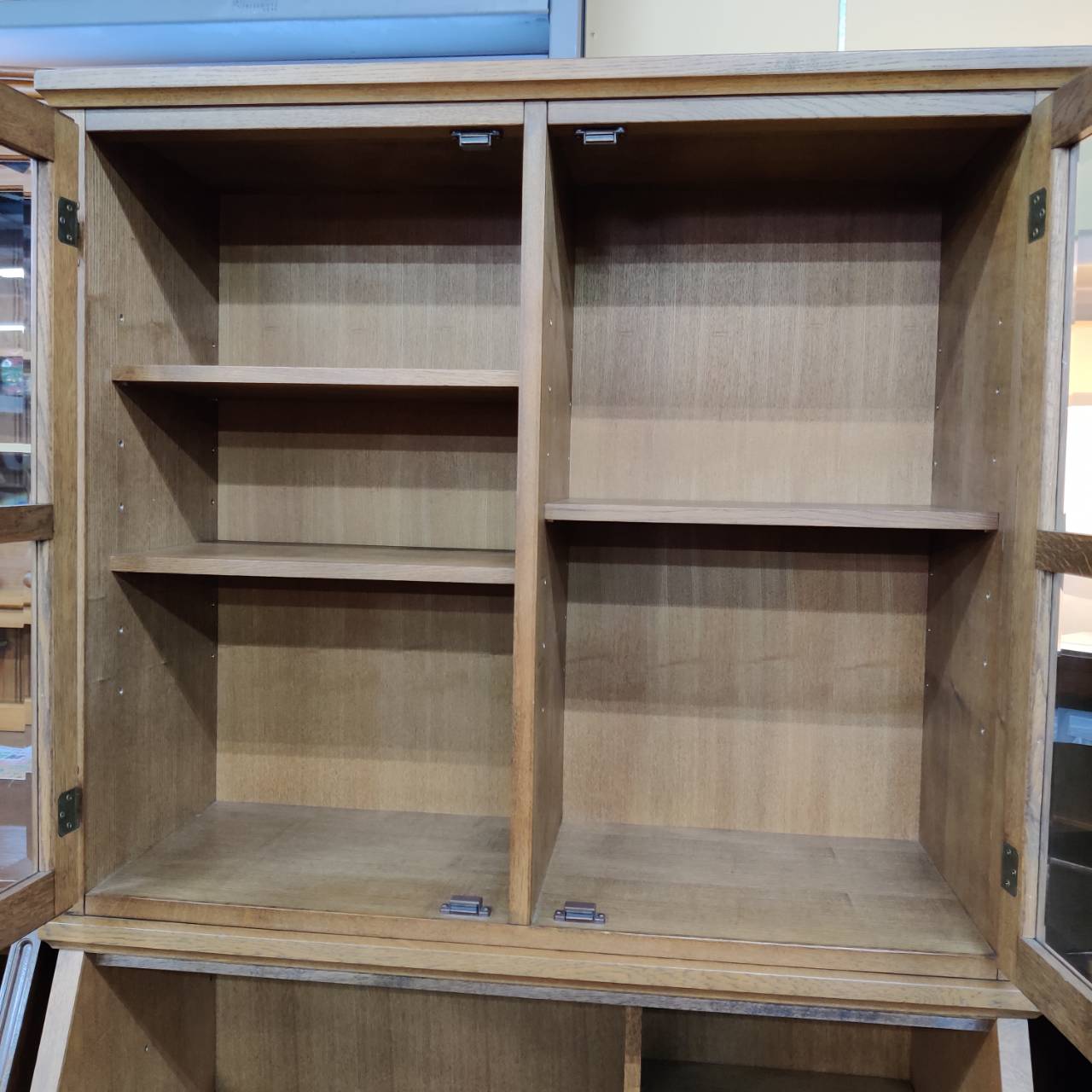 上はガラス扉の飾り棚、真ん中はパタンと開くデスク、下は引出しと扉収納。