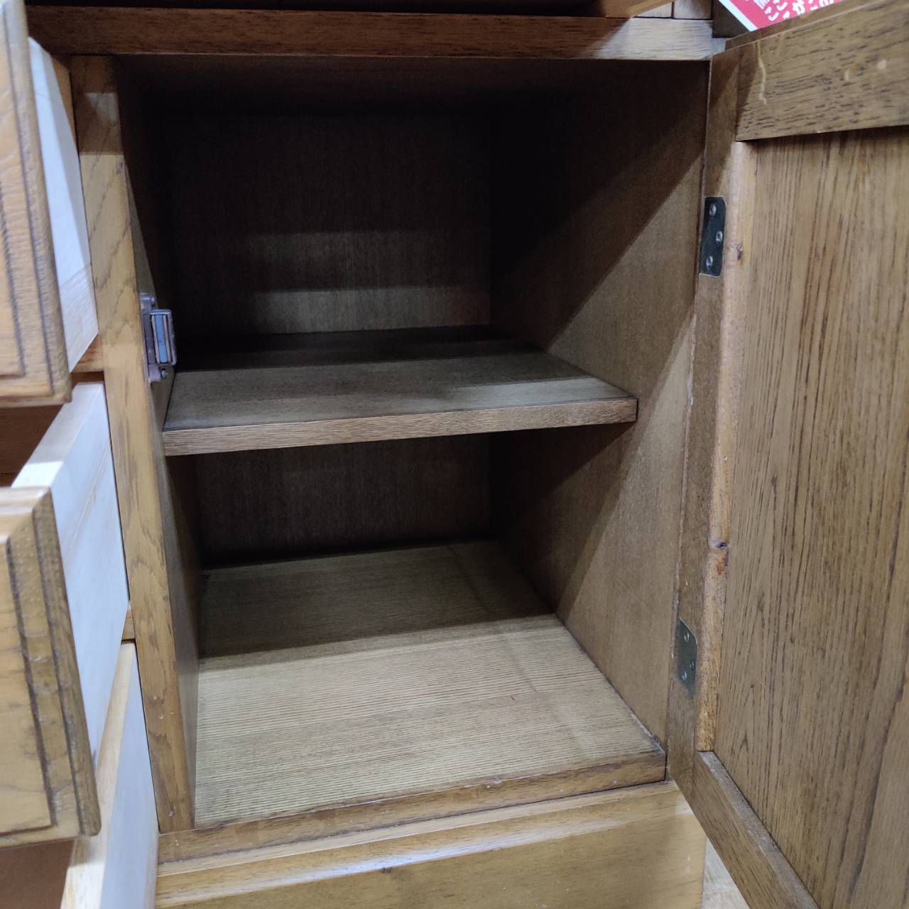 各所に汚れ、キズ、スレ多め。突板の状態に難あり。庫内机面に凹み・歪みあり。上下分割不可(粘着テープ等で接着されている様子あり)。