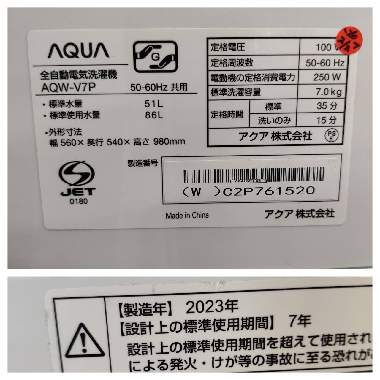 商品名 : 7.0kg 全自動洗濯機