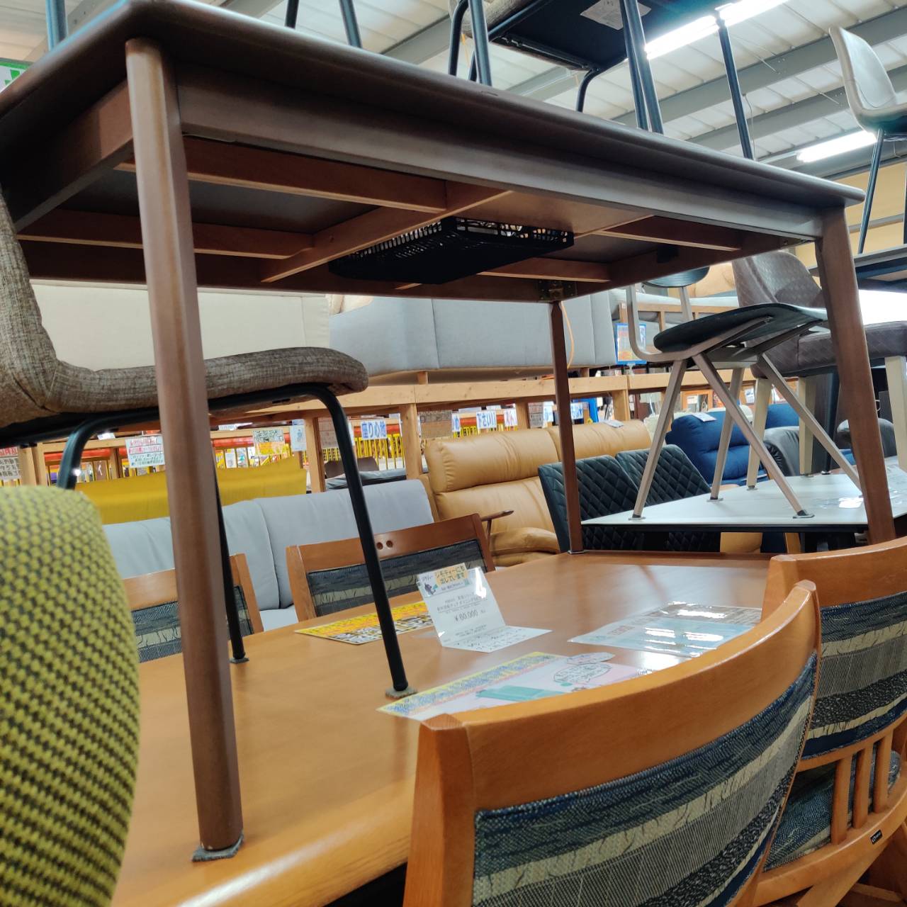 これ、普通のダイニングテーブルに見えますけど、実はヒーター付きの優れものなんですよね。