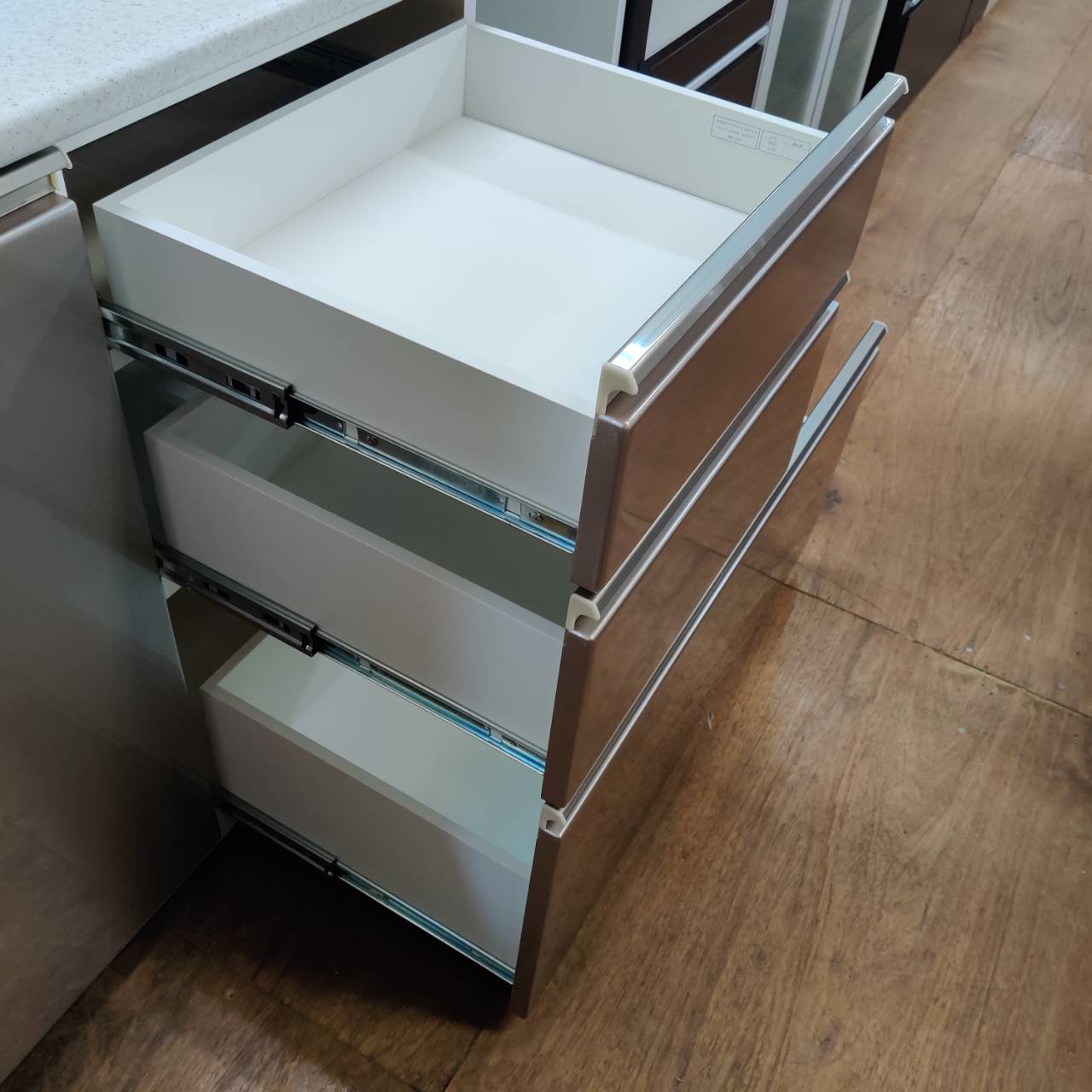 引出しは全段丈夫で動きのスムーズなフルスライドレールを使用。