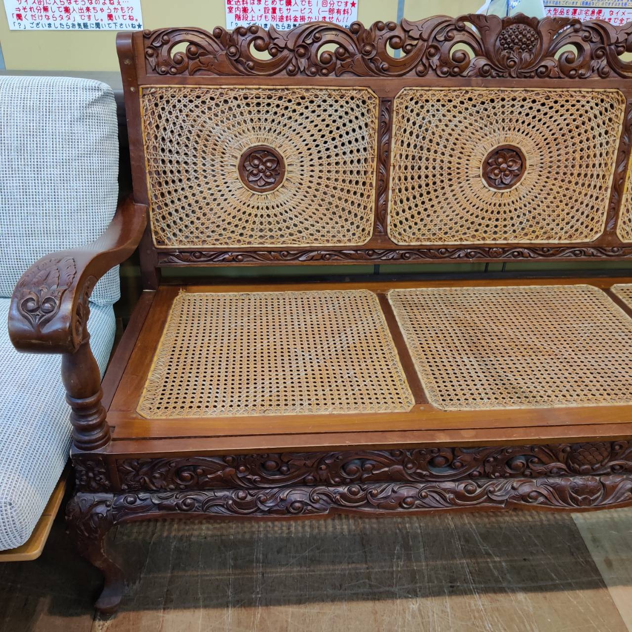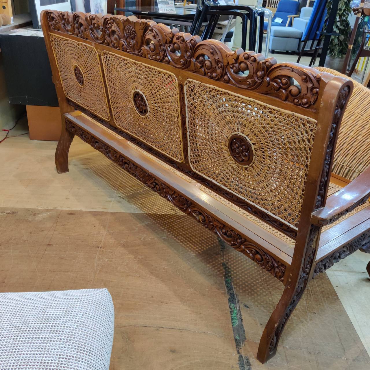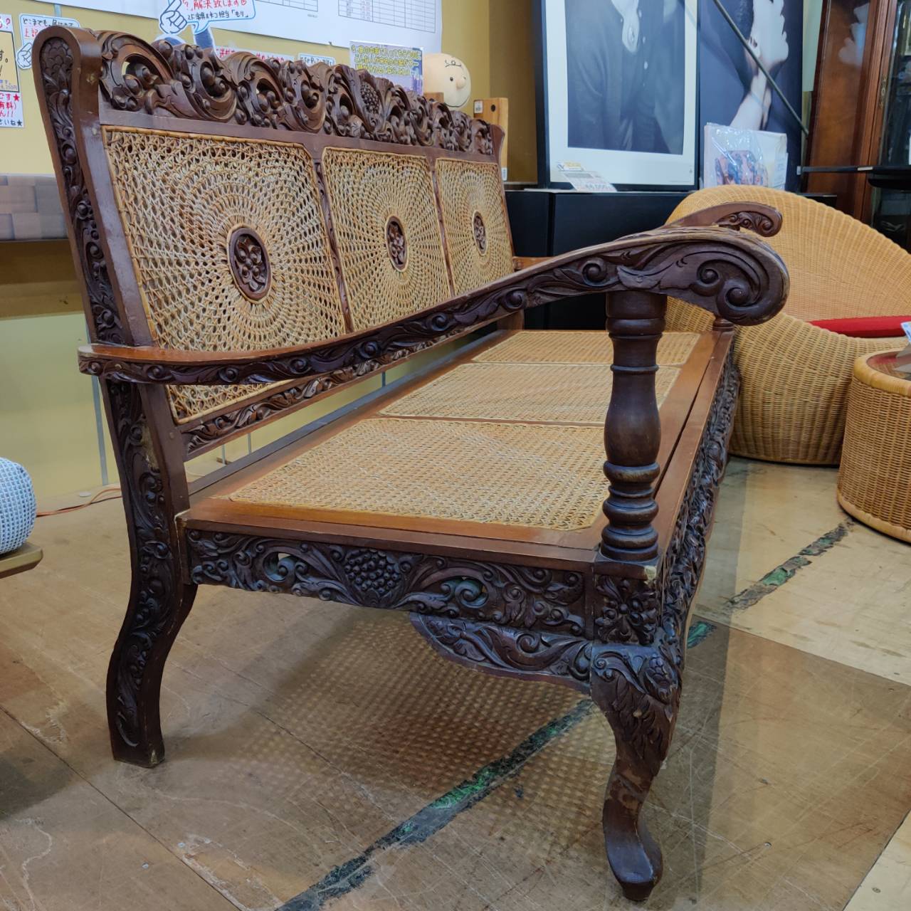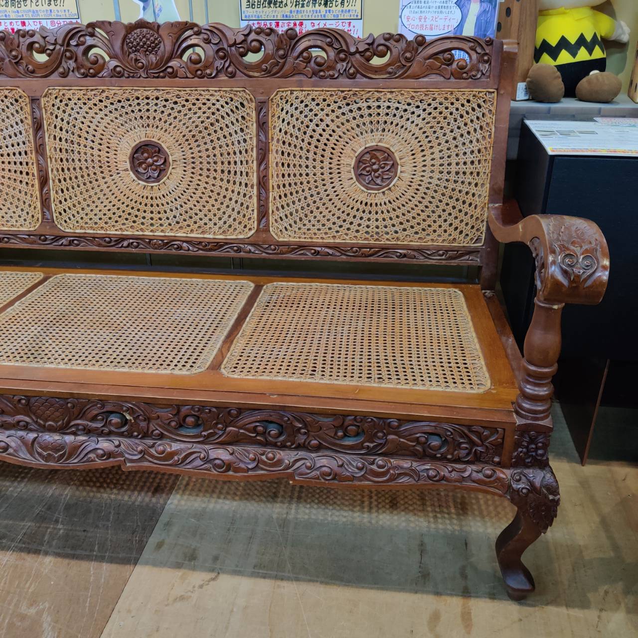 繊細な木彫り装飾が美しい、天然木とラタン(籐)を組み合わせたクラシカルなベンチ。
