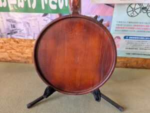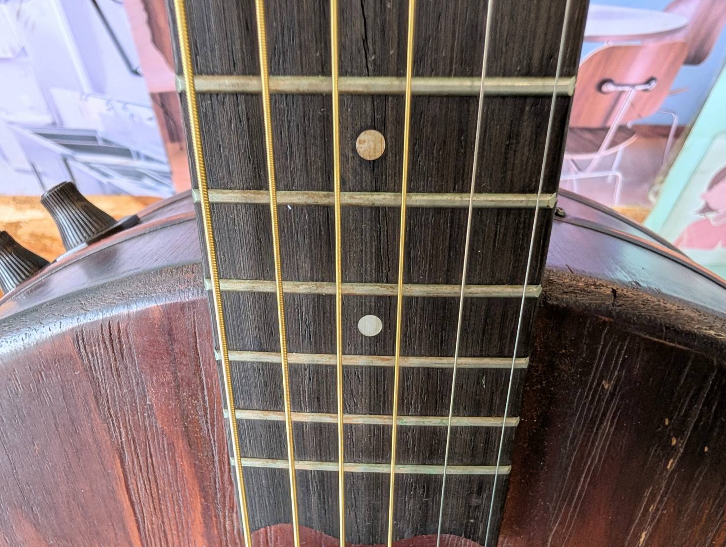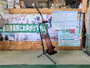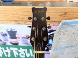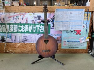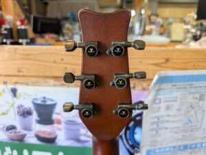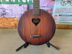 本物のお風呂の桶を使用して作られたギターです。ユニークながらも木目がおしゃれで目を引く一品。(ラベル表記)1999年製の、時代を感じられる深い色合いや風格も魅力的です。見た目と同じように角のない、丸い音色を奏でてくれますよ。