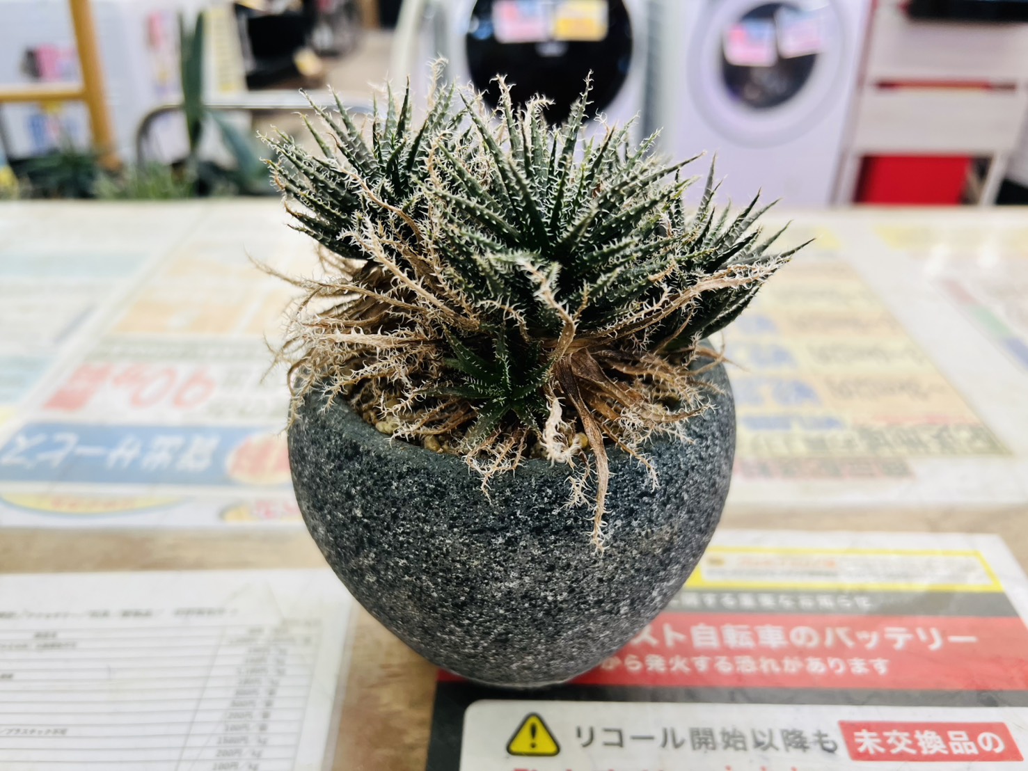 多肉質で濃緑色な葉の縁に、白く柔らかいトゲが密に生えています。