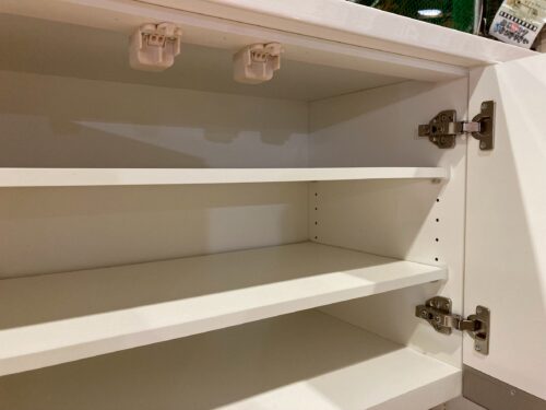 棚板は固定ストッパー式。扉には耐震ラッチが付いているので地震対策もされています。