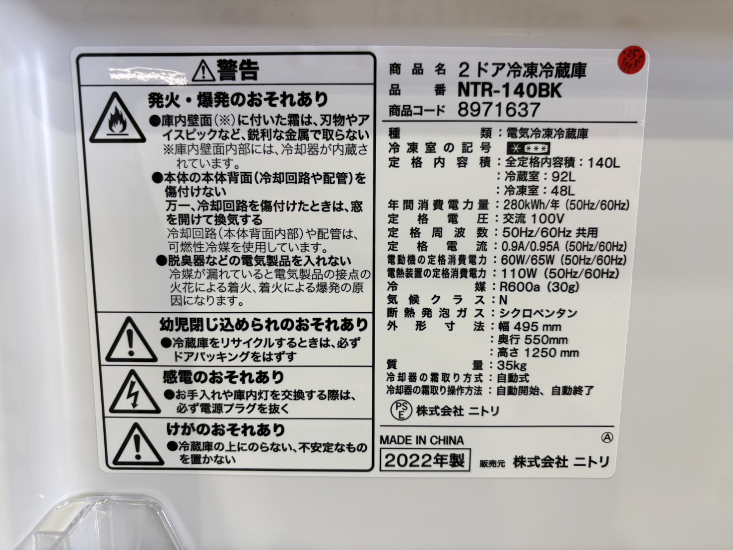 庫内容量:冷蔵室/92L・冷凍室/48L