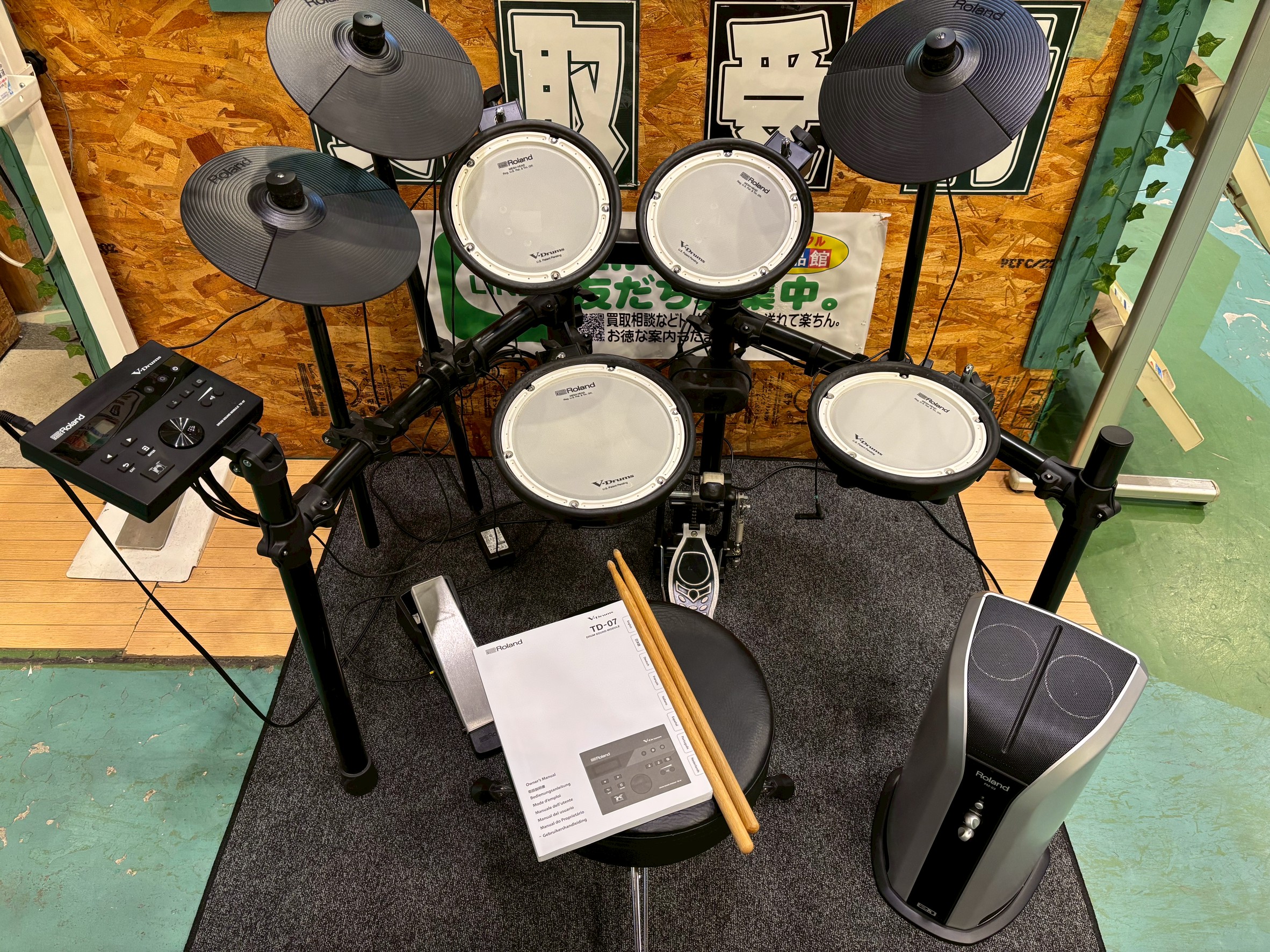 ドラムチェア、防音マット、スティック、取説付き。
