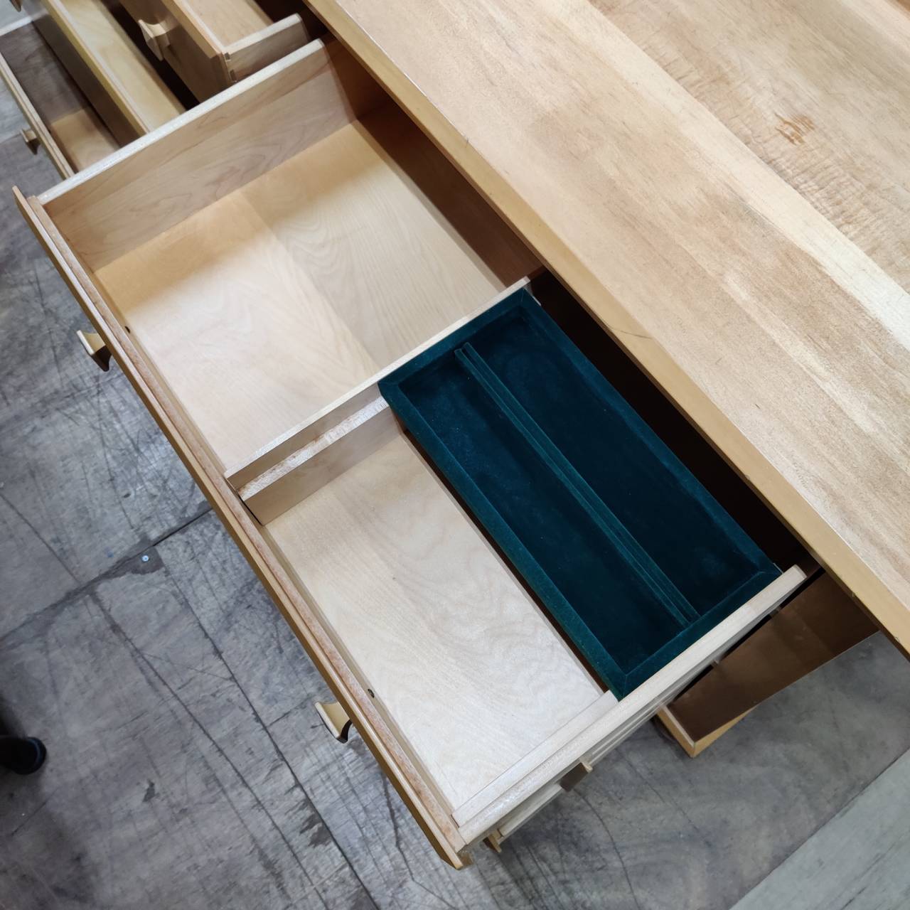 引き出しを開けると、中には緑色のベロアが貼られた仕切りトレイが。