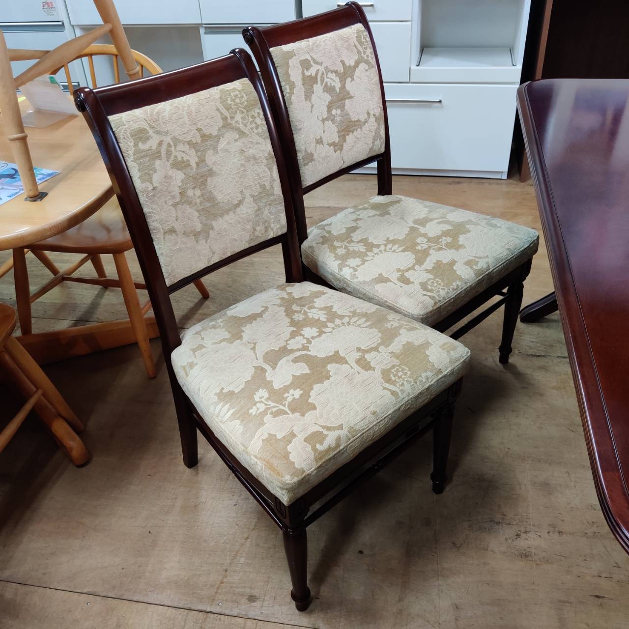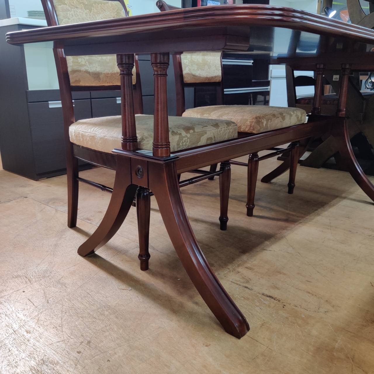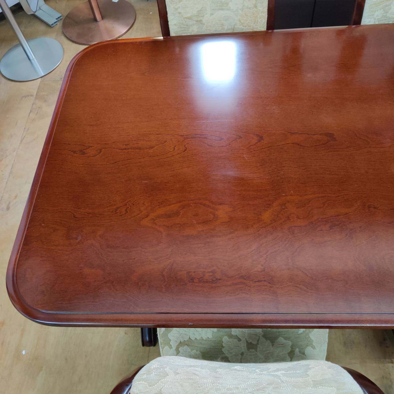 今回入荷したのは、優雅な曲線が美しいフローラのダイニングテーブルと、背もたれの装飾が目を引くスペンサーチェアの5点セット。