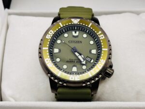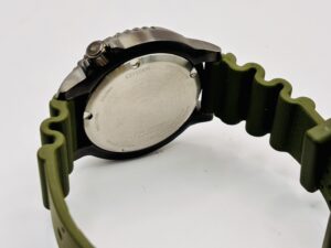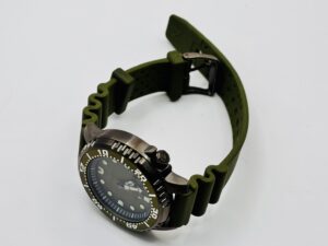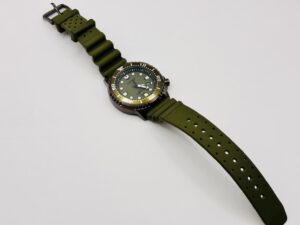 カジュアルなテイストを演出しながらも、ダイバーズウオッチに求められる視認性や堅牢性などの性能を確保しています。