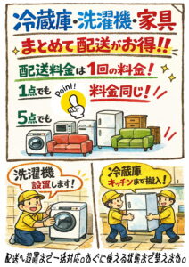 配送から設置まで一括対応。面倒な設置作業も、その場ですぐに使える状態まで整えます。有料配送・設置無料!冷蔵庫・洗濯機はサービスで設置致します。