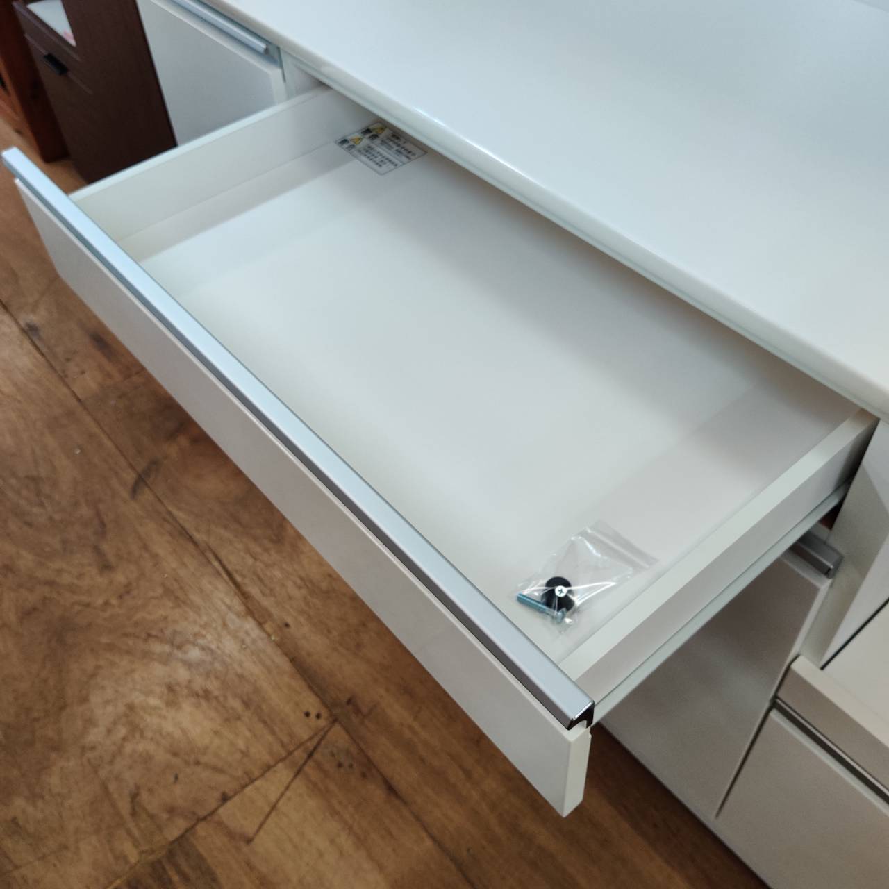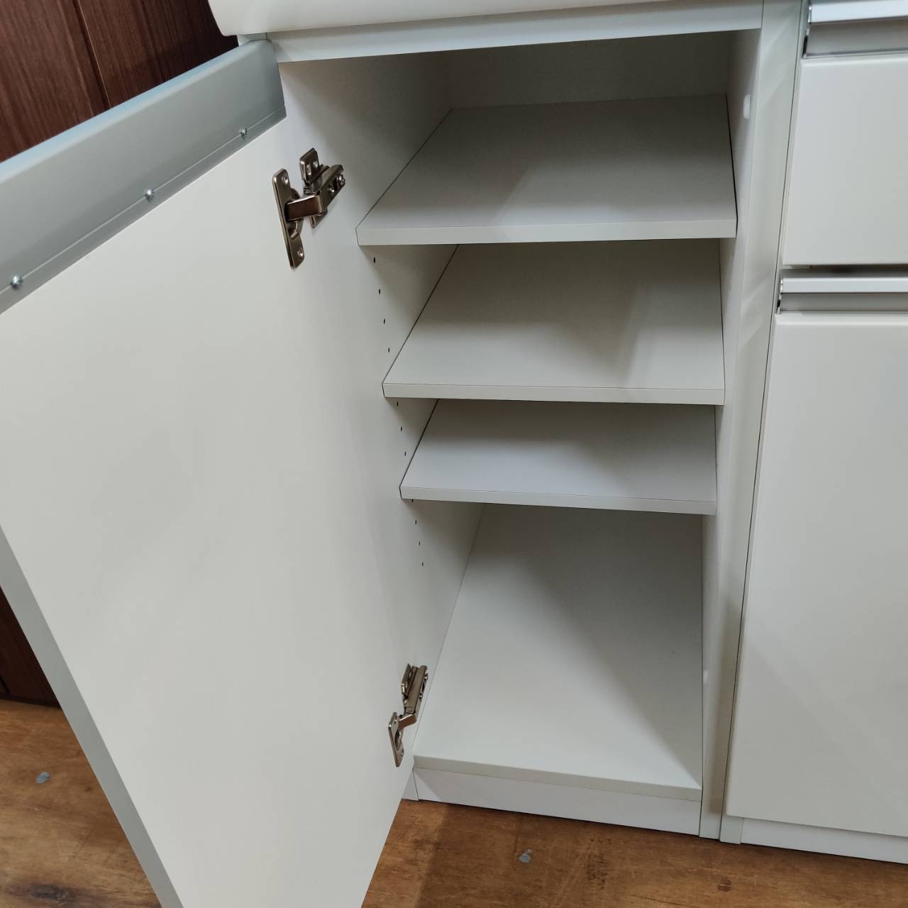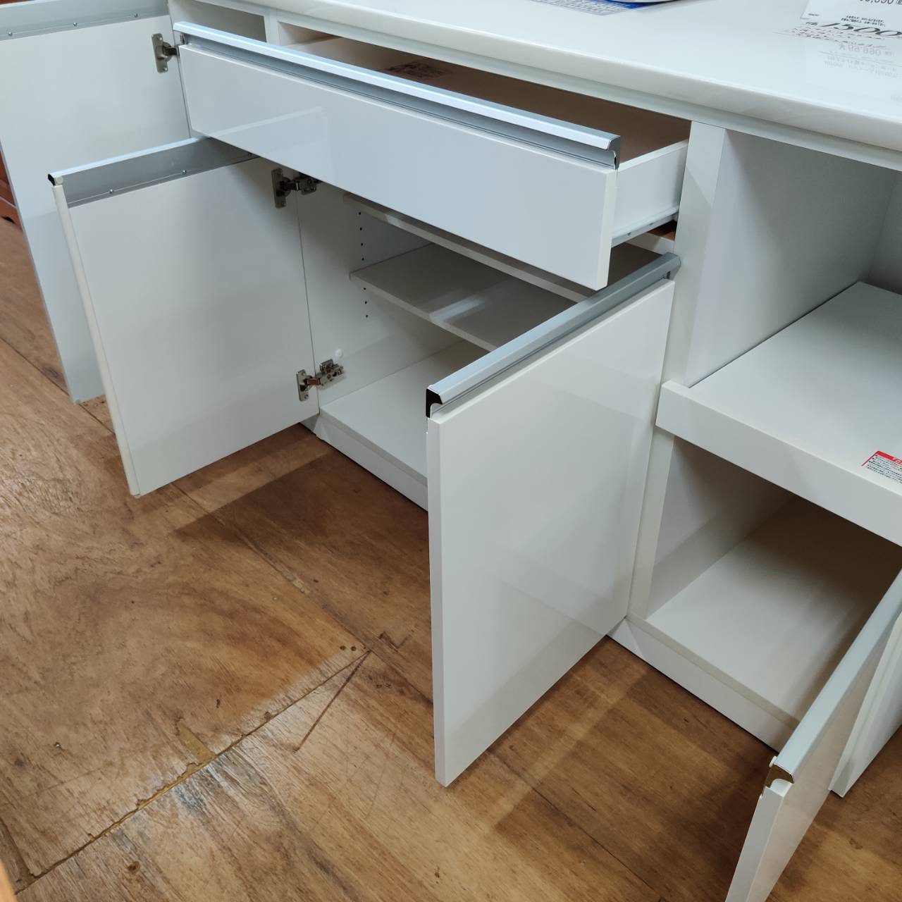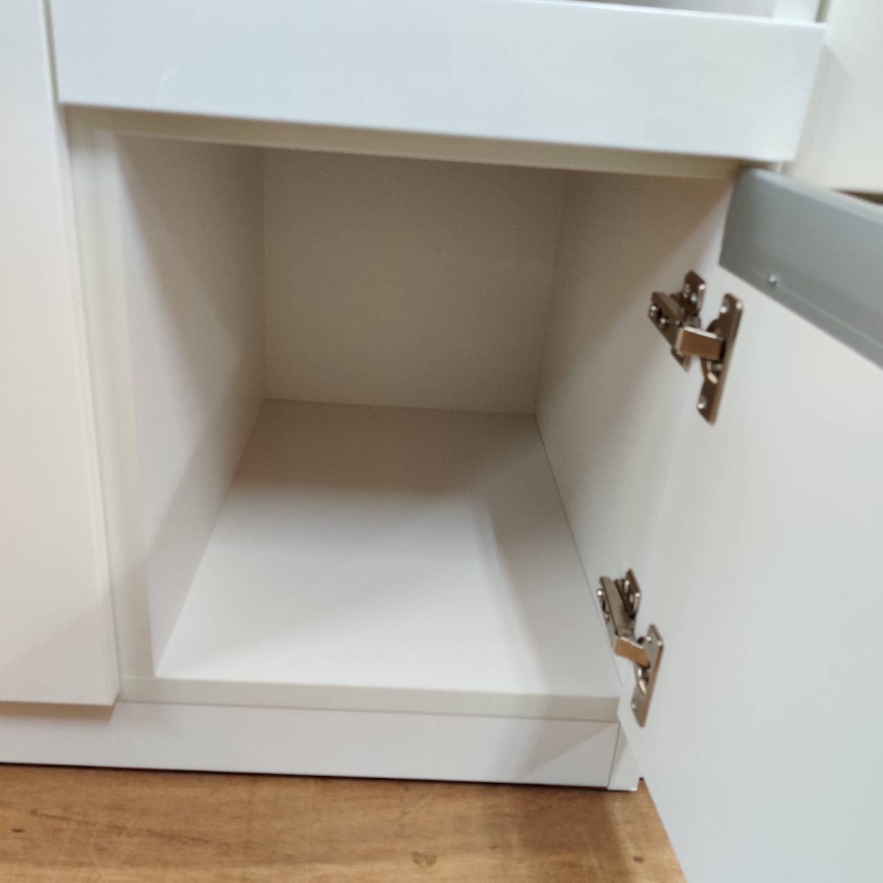 白のハイグロス仕上げは光を反射してお部屋をパッと明るくしてくれるから、キッチン全体の雰囲気がガラリと変わりますよ。
