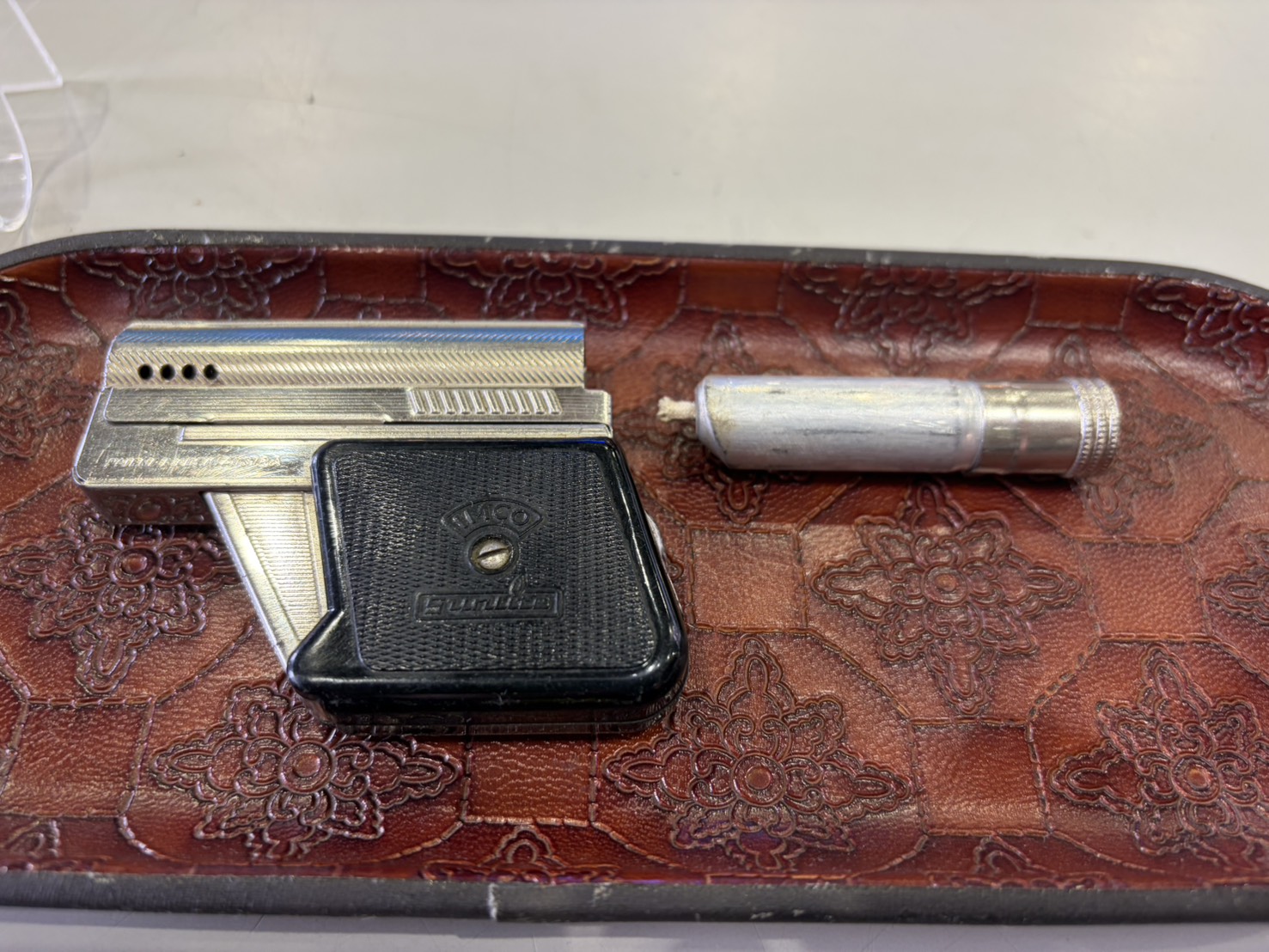 1960〜70年代に製造されたこのモデルは、引き金を引くことで連動して着火するメカニカルなギミックが最大の特徴。さらに、バレル(銃身)部分を抜き取ることで、キャンドルのように使えるオイルタンク機構も健在です。