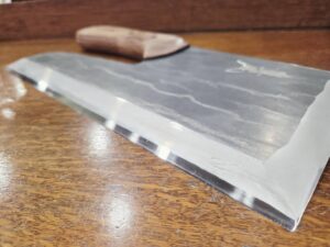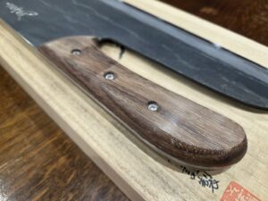 墨が水に流れるような、優雅でやさしい光沢を表現。派手さを押さえた、素朴で、生涯美しいと思える質感です。蕎麦包丁の刃先は、蕎麦を切る上で、理想的な角度。