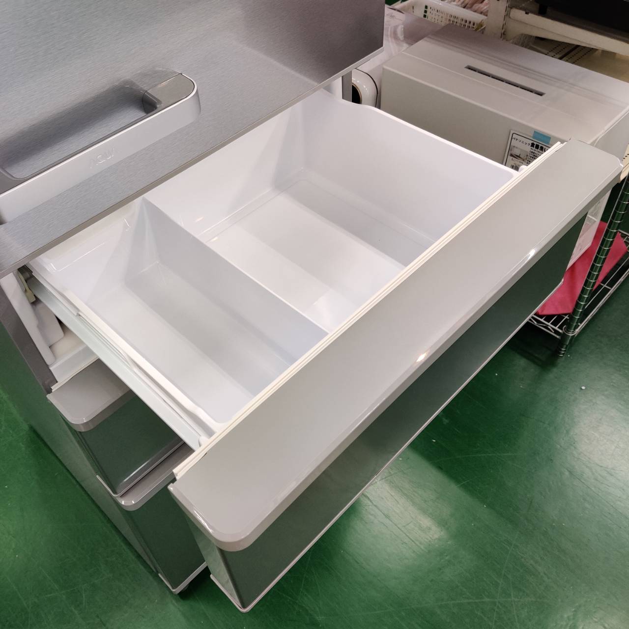 上段は、貯氷コーナーがあり、下段は冷凍食品などをたくさん収納できます。取り出しやすいまん中2段引き出しタイプです。
