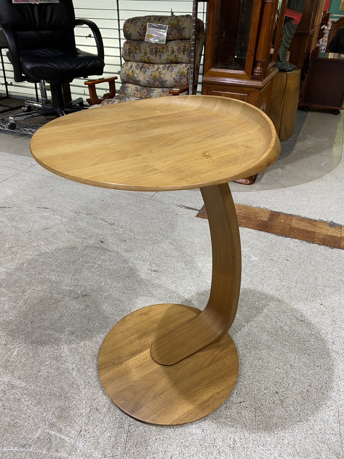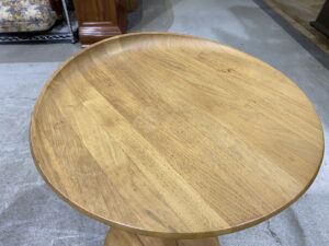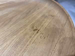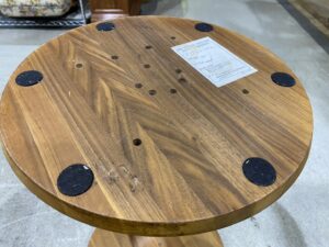 円形の天板の奥には木を削りだし転び止めを施している為、これによりテーブルの奥側のモノの落下を防止します。