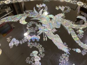 螺鈿細工とは、夜光貝やアワビの貝の真珠質の部分を削って磨き、塗装面に張りつけたり、はめ込んだりする技法を用いて作られる装飾技法の1つです。