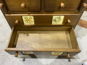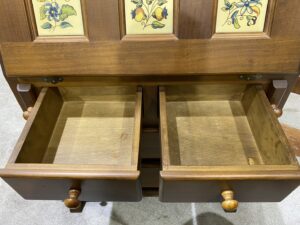 カントリー家具でも人気を集めるパイン材フレームを使用し、花の絵柄をあしらったホワイト色の陶板がアクセントに効いたデザインのチェスト。
