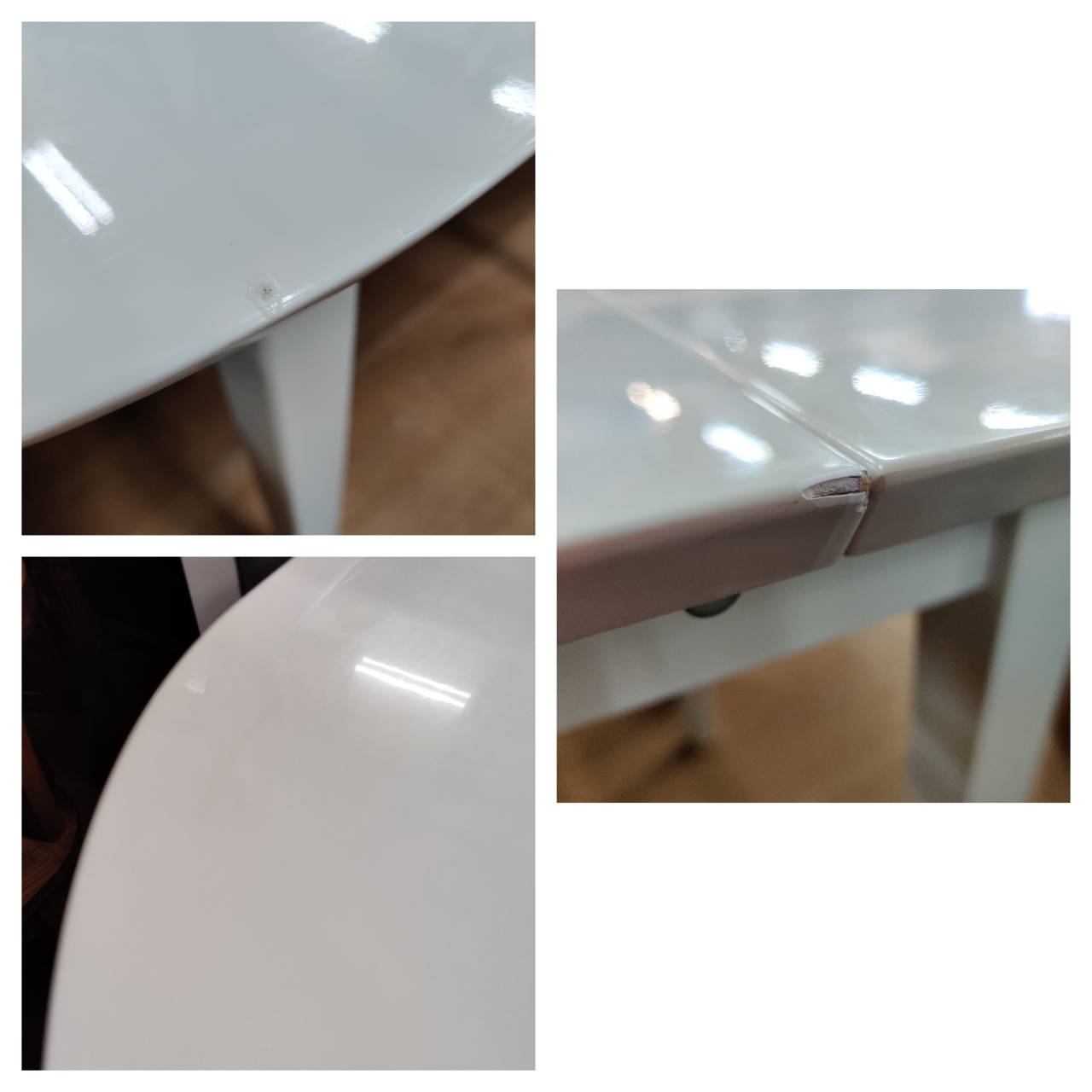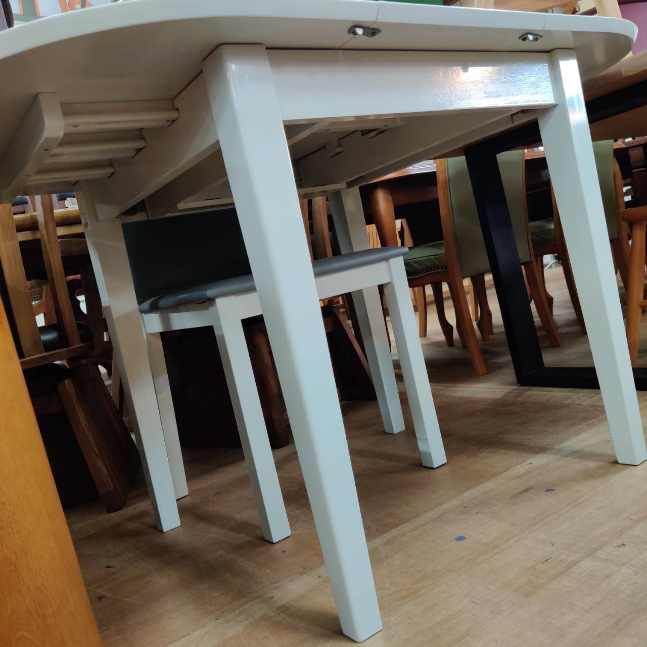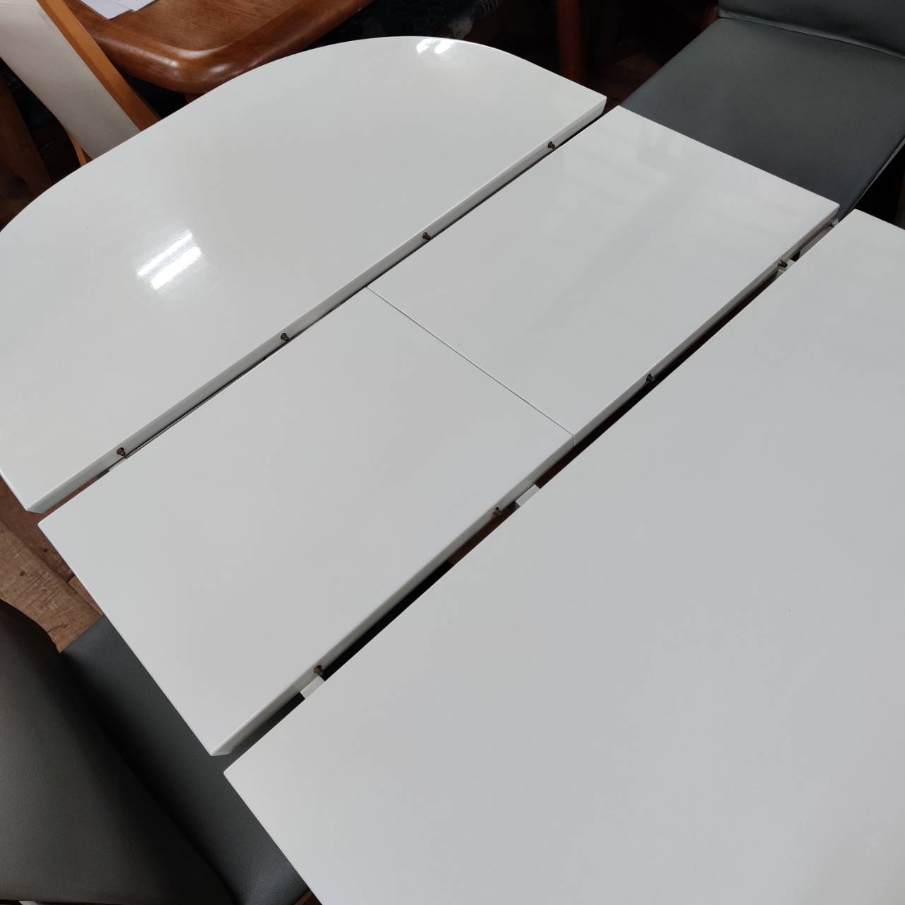 光沢のあるホワイトカラーが清潔感を演出する、伸長式ダイニングテーブルセットです。