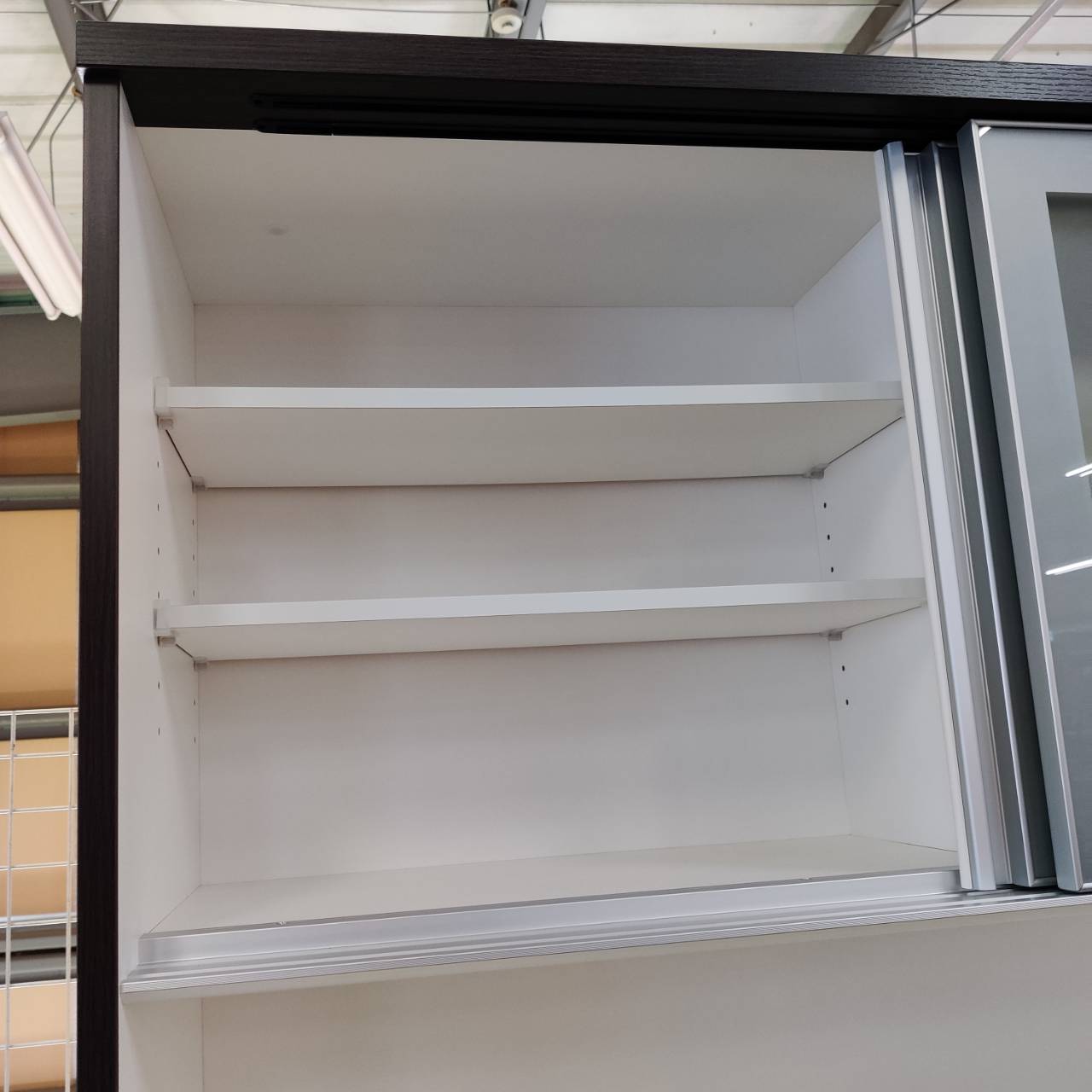 上台はアルミフレームのガラススライド扉、下台は引き出しタイプのキッチンボードです。