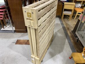 高さ24センチの低床型で高齢の方や小柄な女性でも、両足に力を入れて、よろけずに経ちやすい総桐のスノコ式の折りたたみベッド。