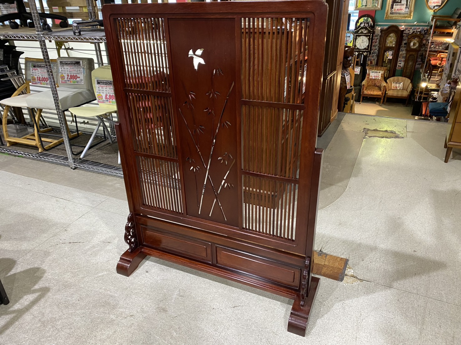 鳥と竹の躍動感ある透かし彫りと格子柄に、時代感漂う高級感ある衝立です。