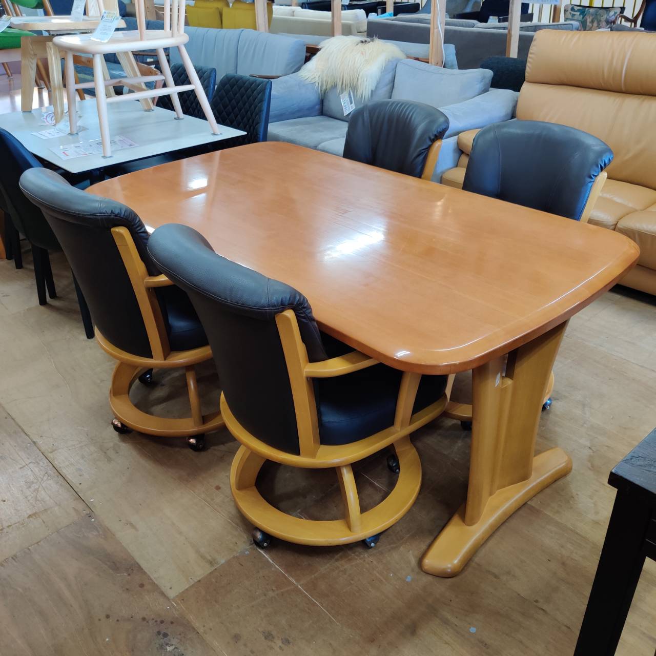 テーブル&キャスター付きでくるっと回る肘付きチェア×4脚の5点セットです。