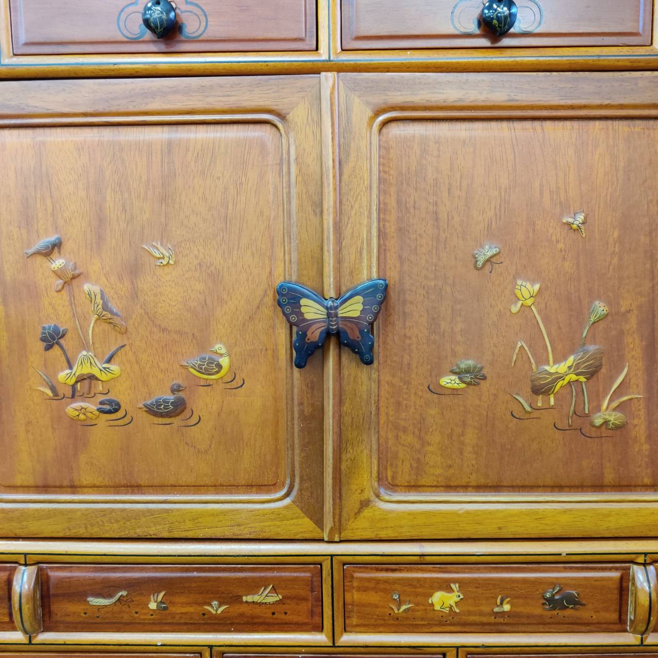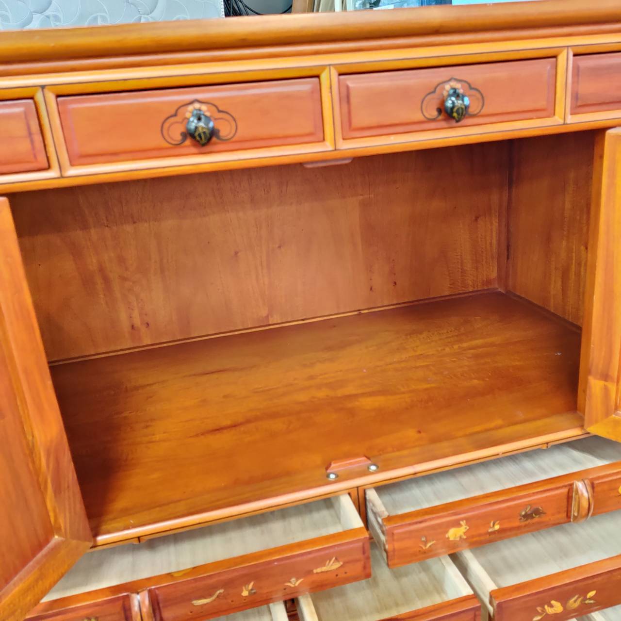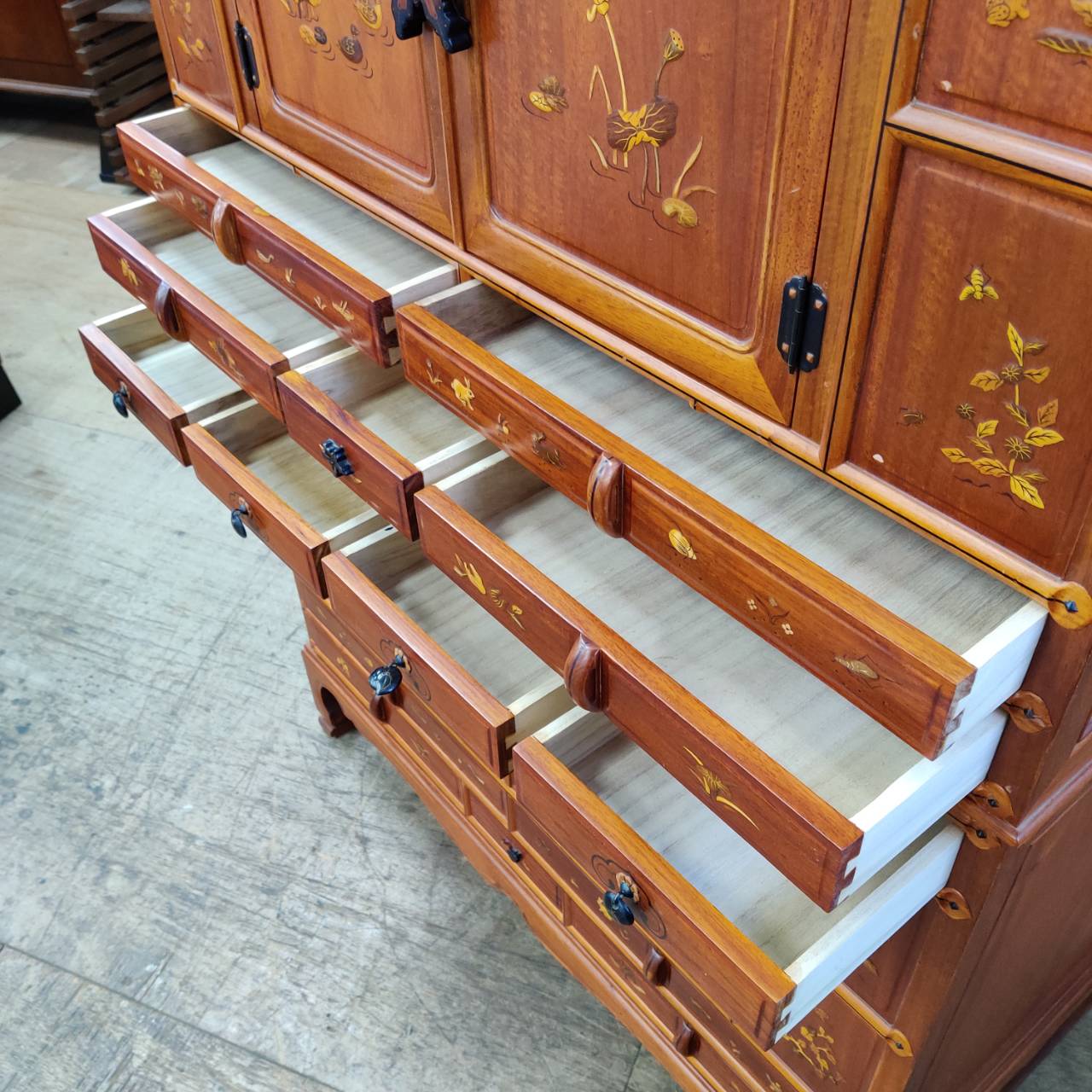 たくさんの引出しと、観音開きの収納部が2ヶ所にあります。