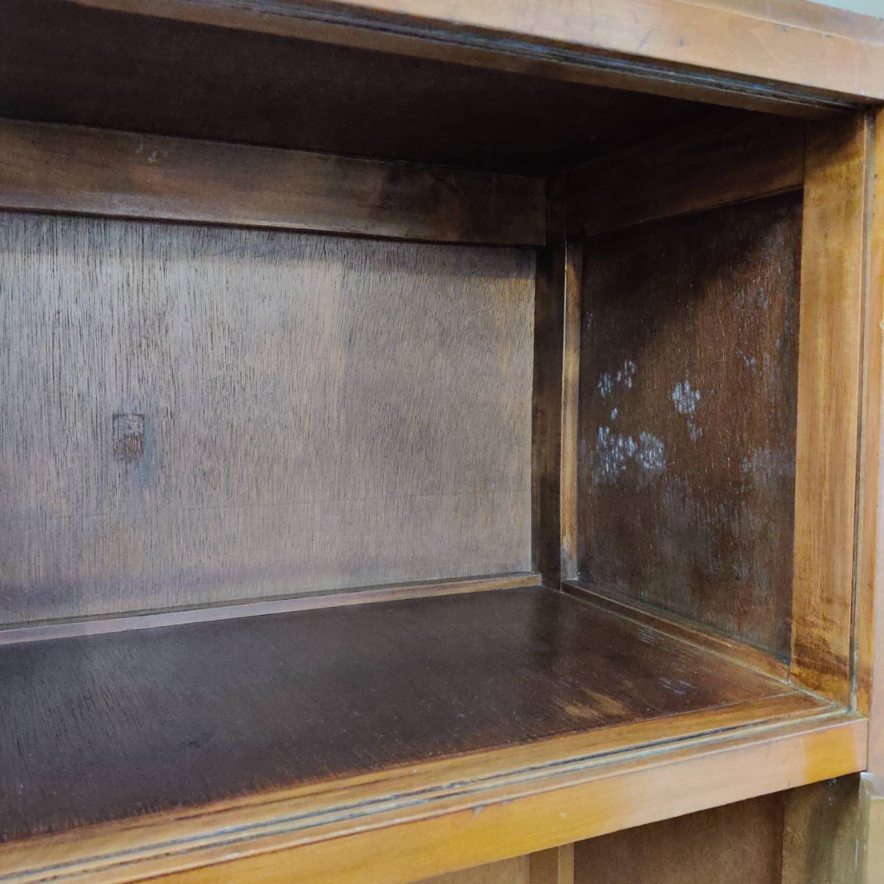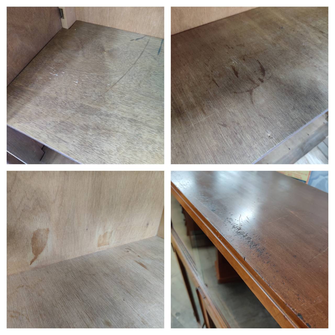 各所にキズ、スレ、ハガレ、扉の歪み等がある現状渡し品。内部棚板に輪染みや使用感あり。