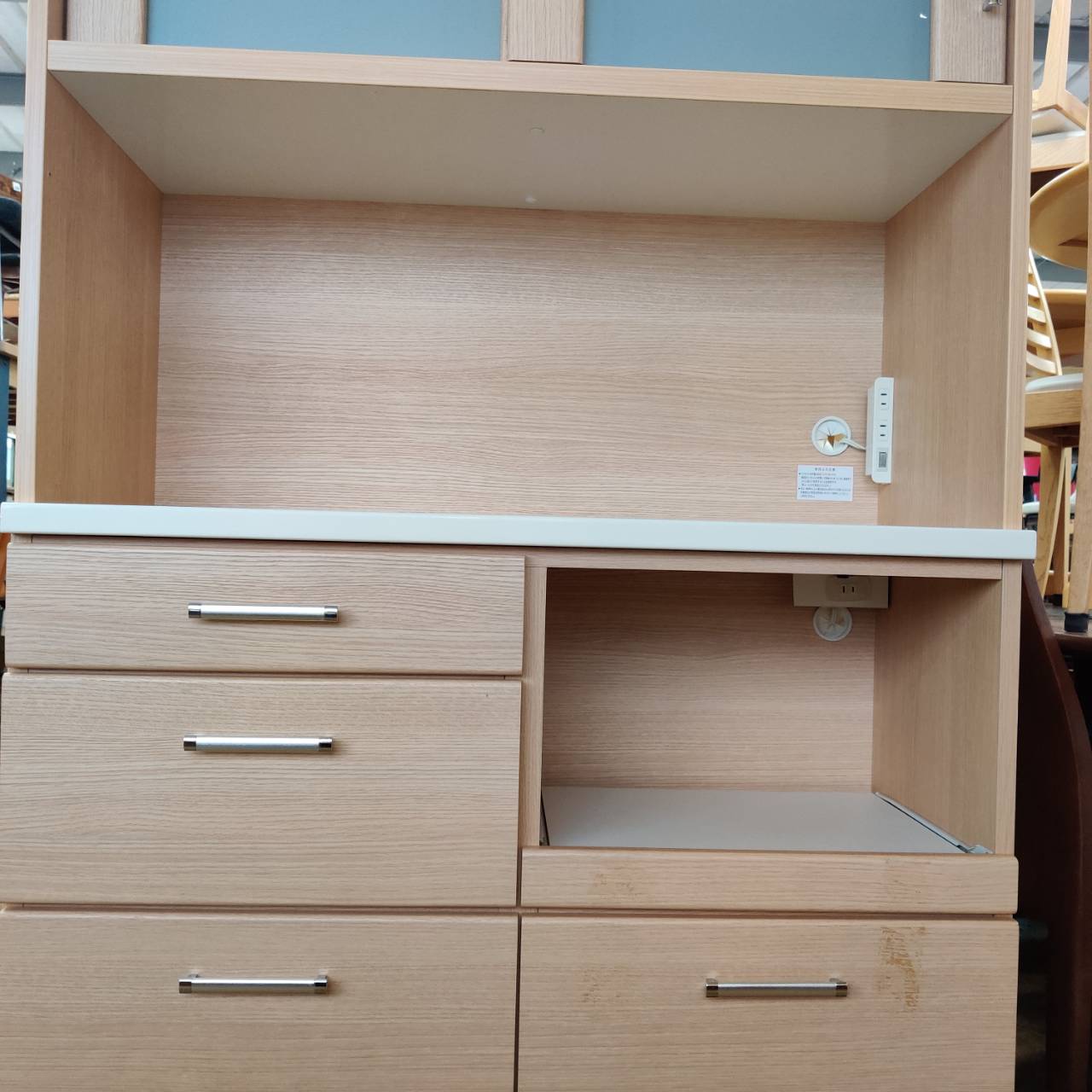 オープン部分にはコンセントも付いているから、お気に入りのコーヒーメーカーやトースターを置くのにもぴったり。