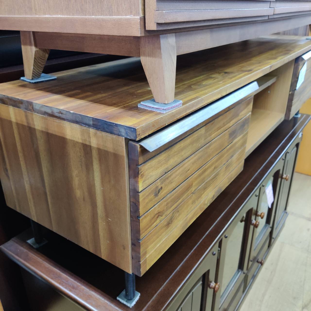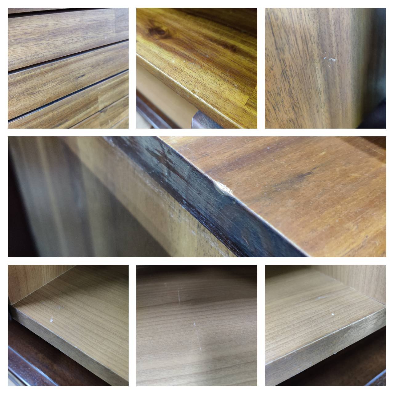 全体スレ・キズ・ハガレ多少有、天板ボンド補修有、右引出レバー割れ有