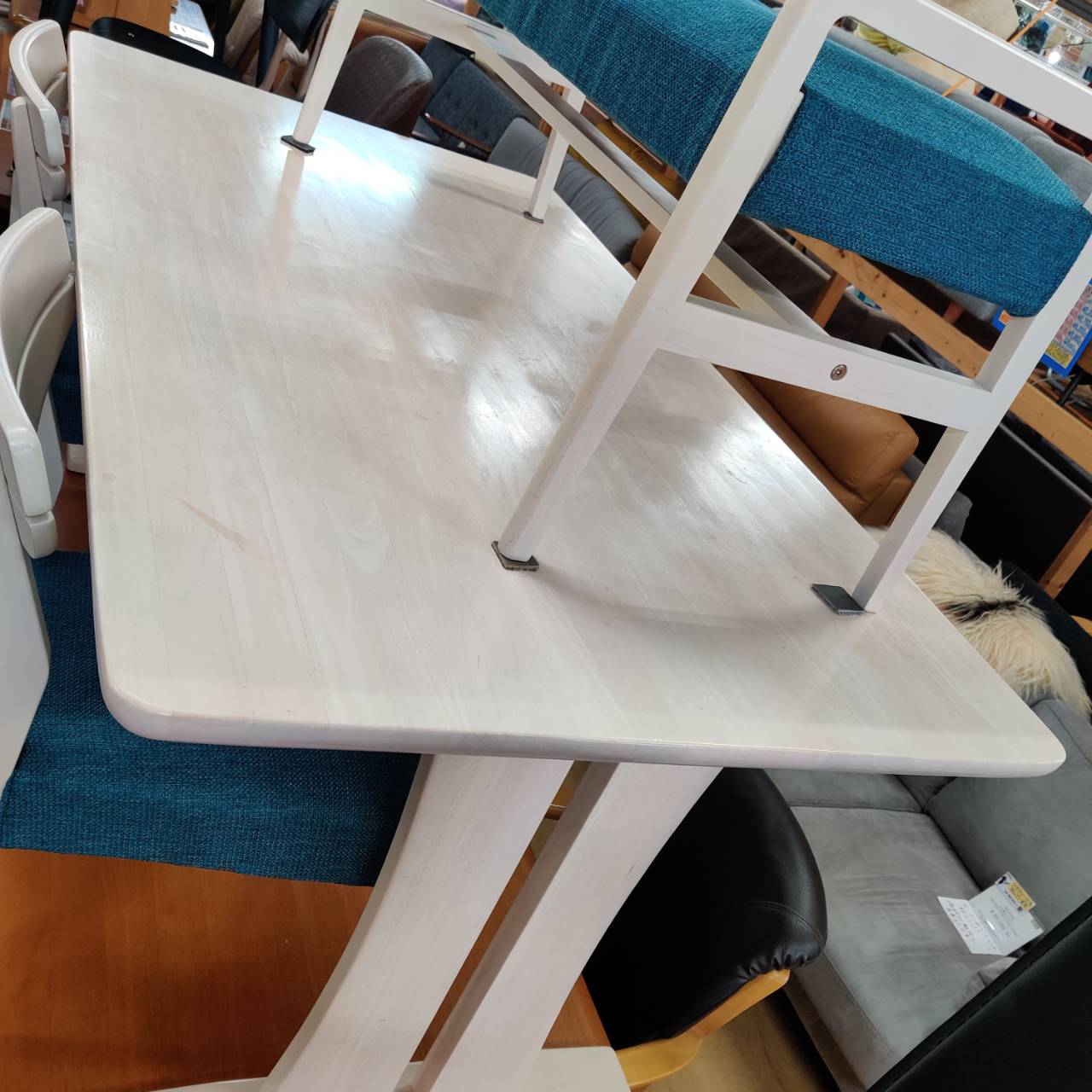 東京インテリアの「アンジェ」テーブルに、ニトリの人気シリーズ「アルナス」のチェアとベンチを合わせたセットです。