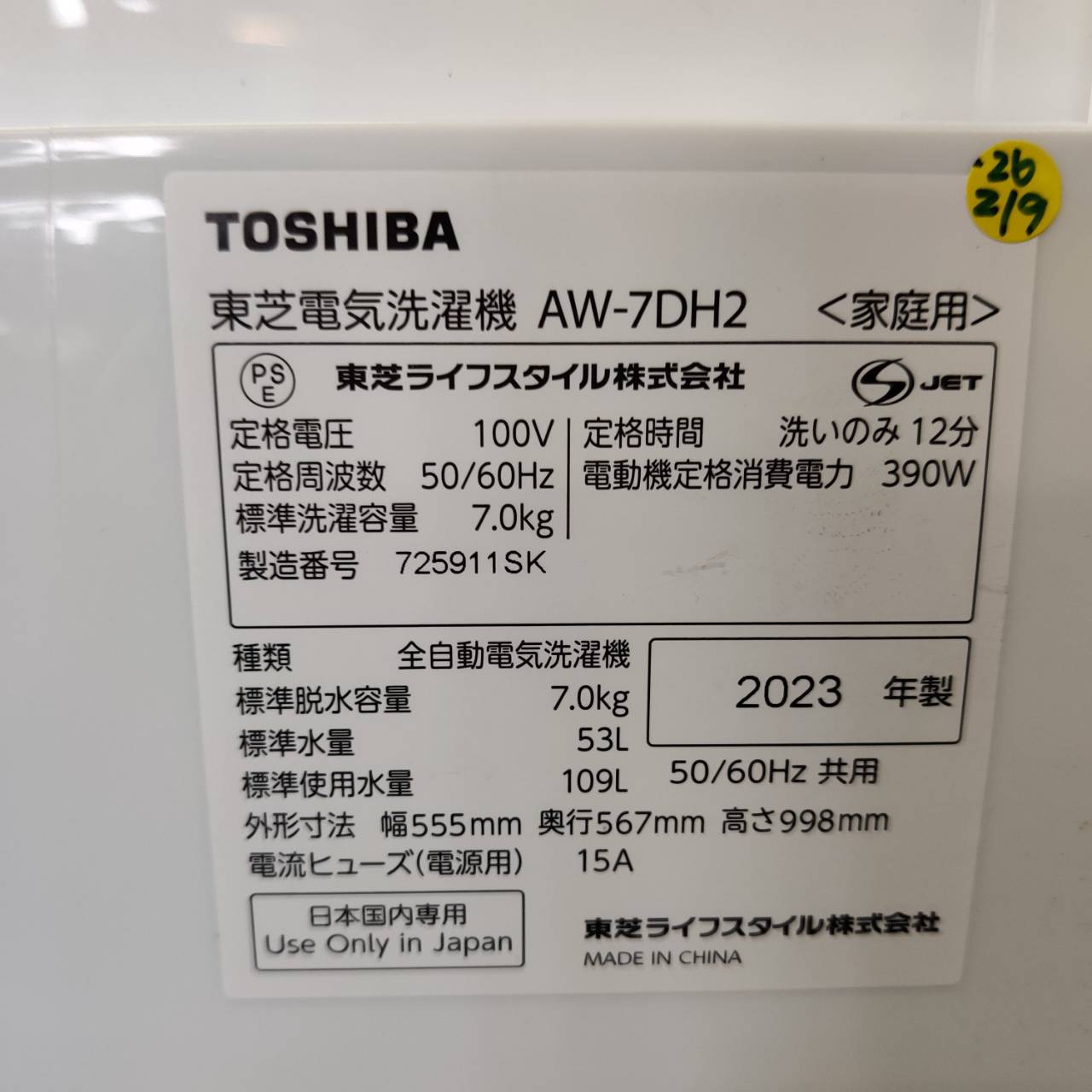 商品名 : 7.0kg 全自動洗濯機