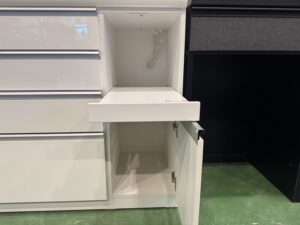 全段奥の物が出し入れしやすいフルオープンタイプで、また耐久性の高い底受け構造レールが引出しの荷重を分散して受け止めます。
