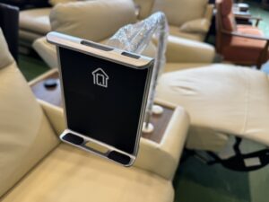 タブレットホルダーは左右どちらのソファにも、見やすい位置に固定でき、お好みの角度に調整可能です。